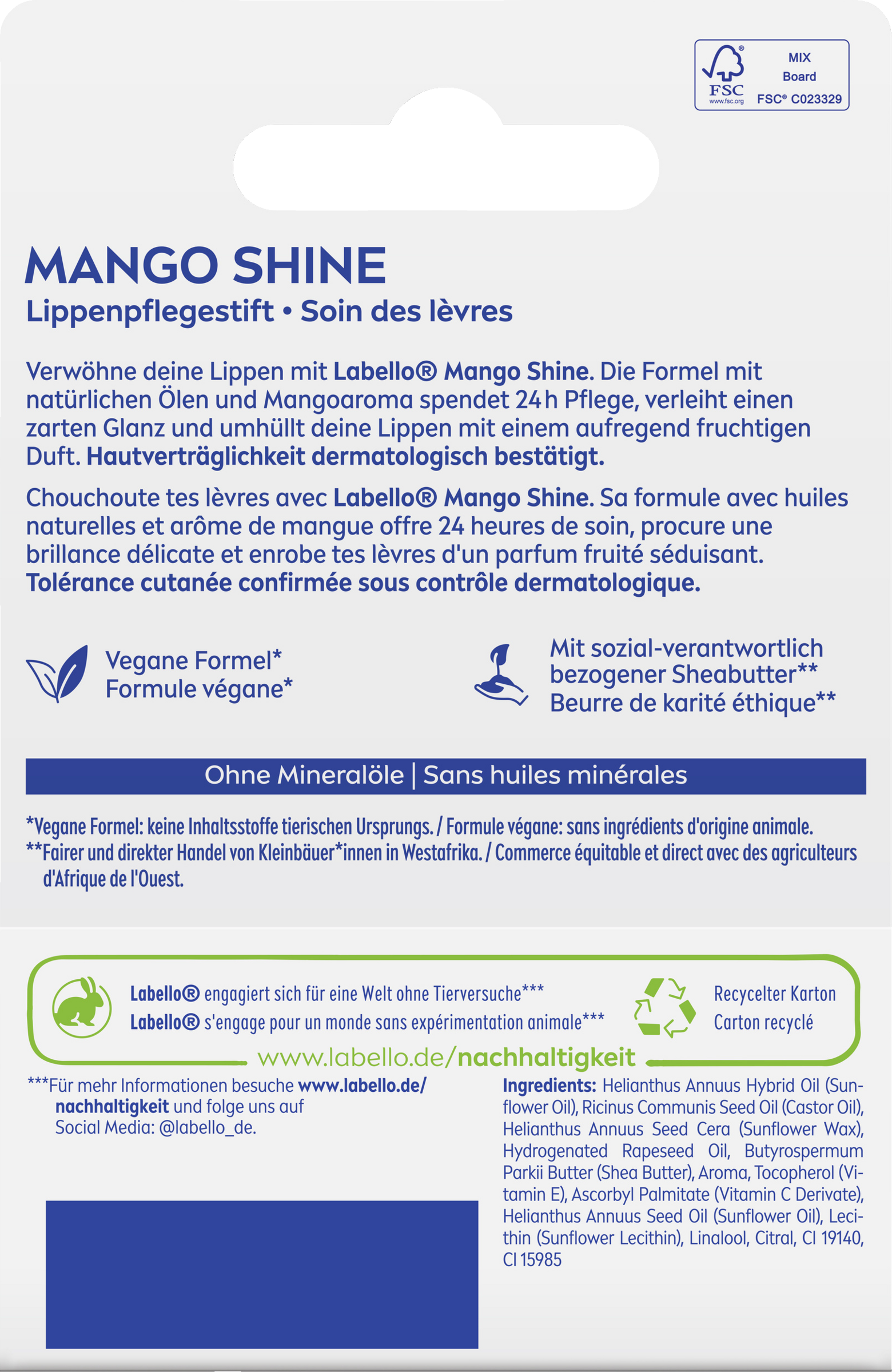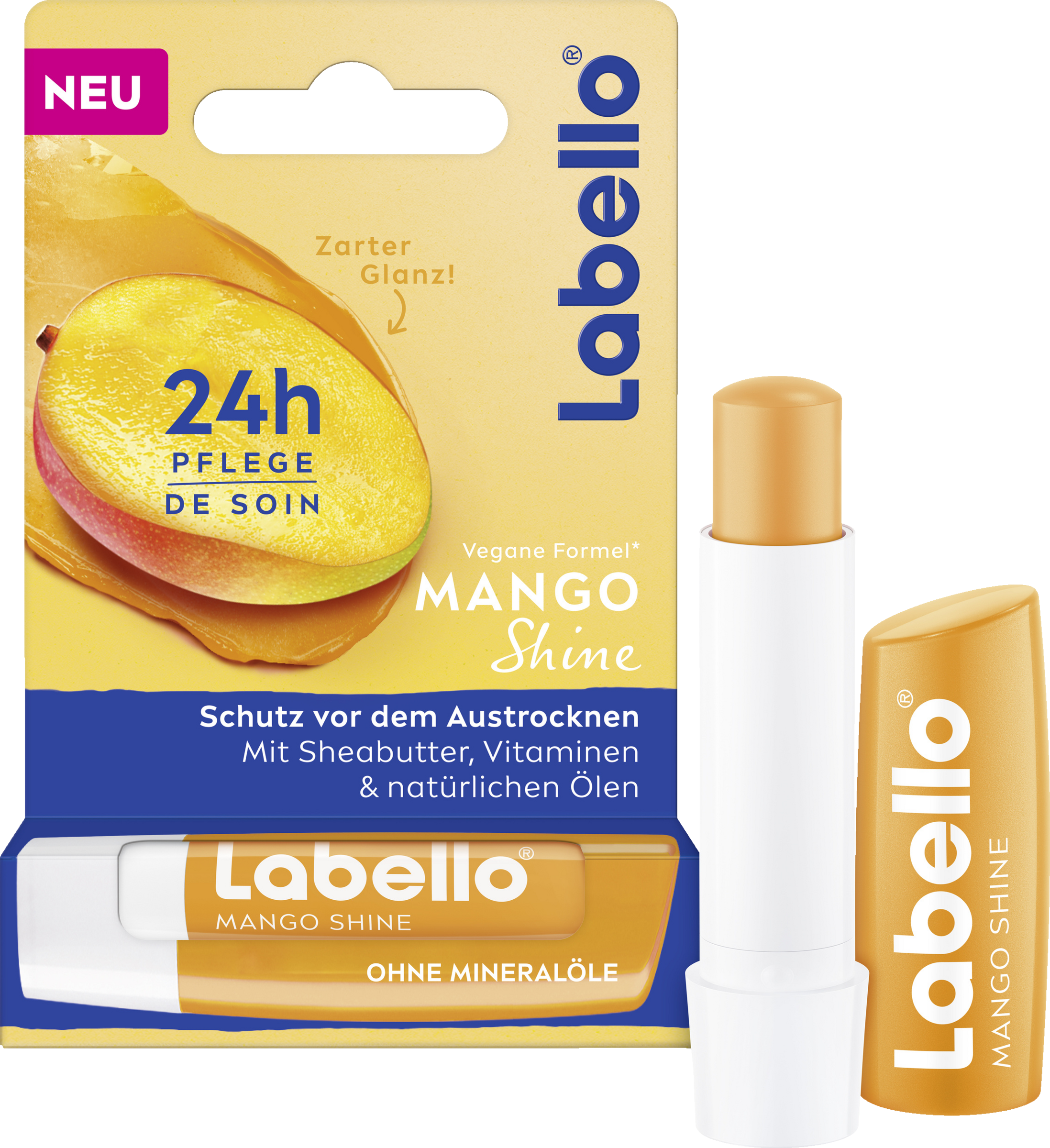 Der Labello Mango Shine vereint intensive Pflege mit einem Hauch von zartem Glanz und dem fruchtigen Aroma von reifen Mangos für unwiderstehliche schöne und gepflegte Lippen. Verwöhne deine Lippen mit dem Labello Mango Shine je nach Bedarf. Die vegane Formel mit natürlichen Ölen und Kirscharoma spendet dir 24 Stunden lang Pflege und schützt deine Lippen vor dem Austrocknen und das ganz ohne Mineralöle. Der Lippenpflegestift verleiht deinen Lippen ein zartes Finish und umhüllt sie mit dem aufregenden Duft von Mangos. Die Lippenpflege ist rückfettend und versorgt die Lippen mit wertvollem Vitamin E, Sonnenblumenöl sowie reichhaltiger Sheabutter für frisch aussehende und spürbar gepflegte Lippen und das den ganzen Tag. Entdecke die verlockende Kombination aus Pflege und verführerischem Duft für ein unvergleichliches Lippenverwöhnprogramm.