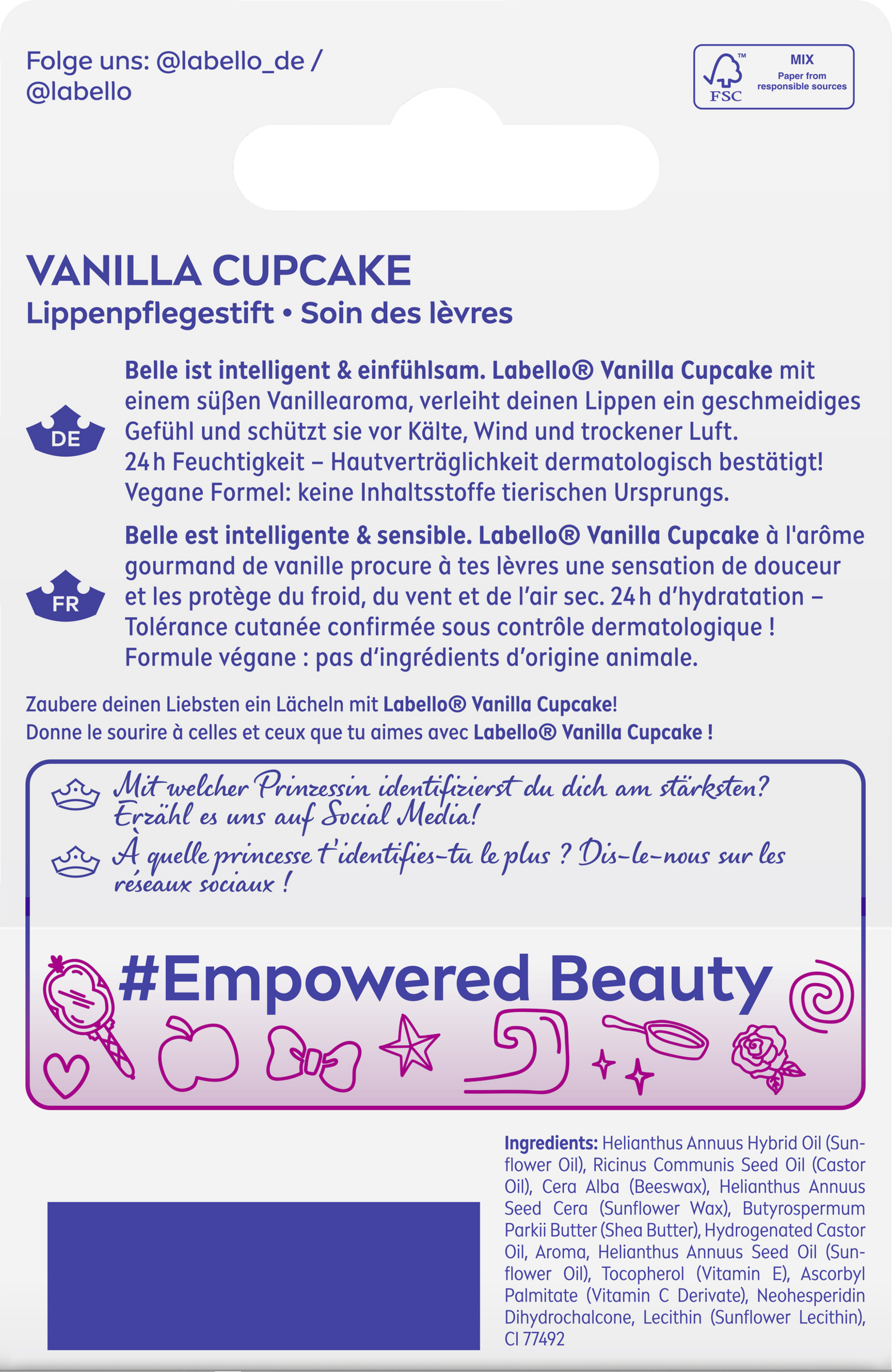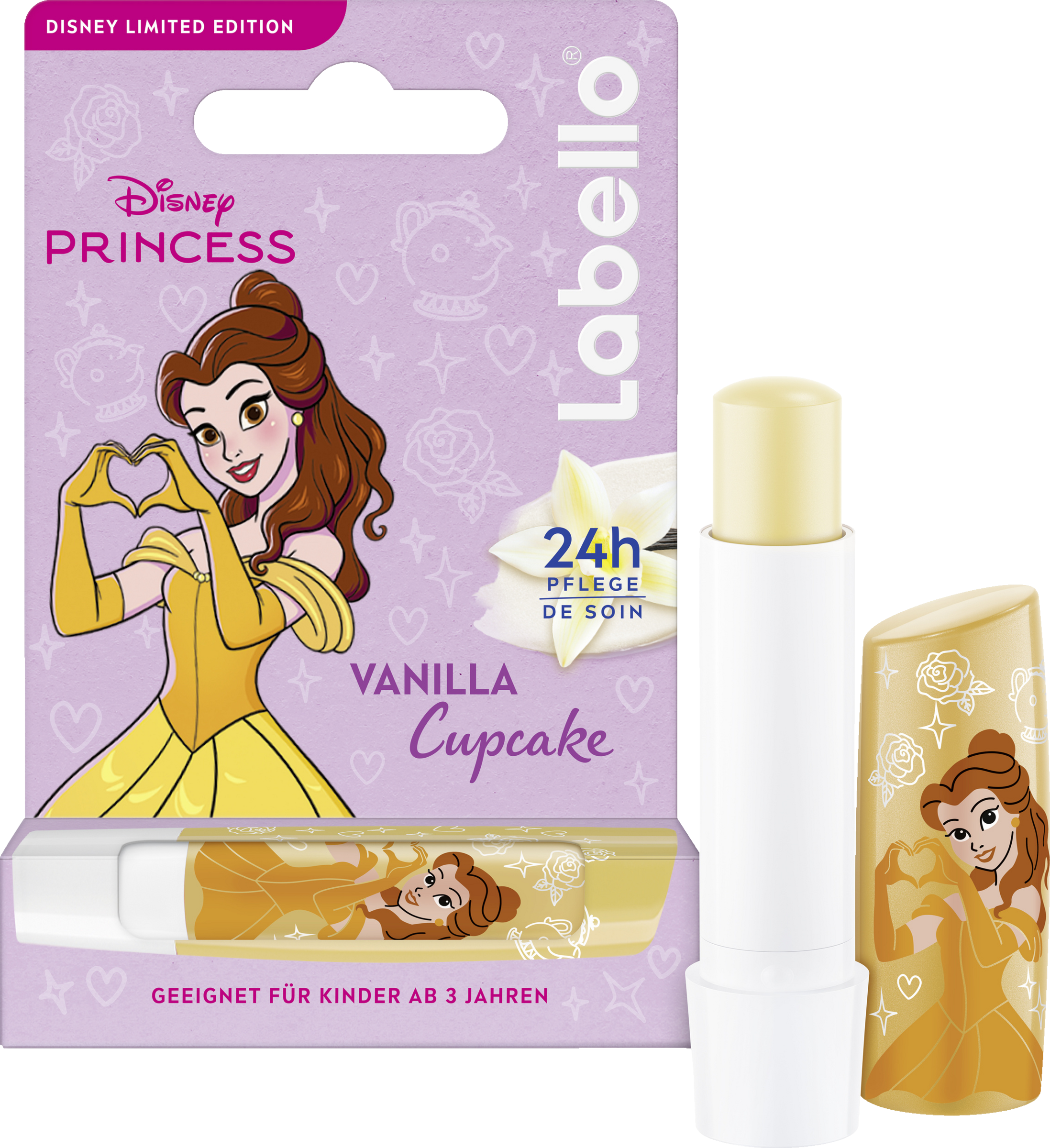 Verwöhne deine Lippen mit Labello Vanilla Cupcake der Limited Disney Princess Edition. Die Formel mit süßem Vanillearoma spendet 24h Pflege und schützt sie vor dem Austrocknen - ganz ohne Mineralöle. Der Lippenpflegestift verleiht deinen Lippen ein geschmeidiges Gefühl und umhüllt sie mit dem süßen Duft von Vanille. Für frisch aussehende und spürbar gepflegte Lippen - den ganzen Tag.
