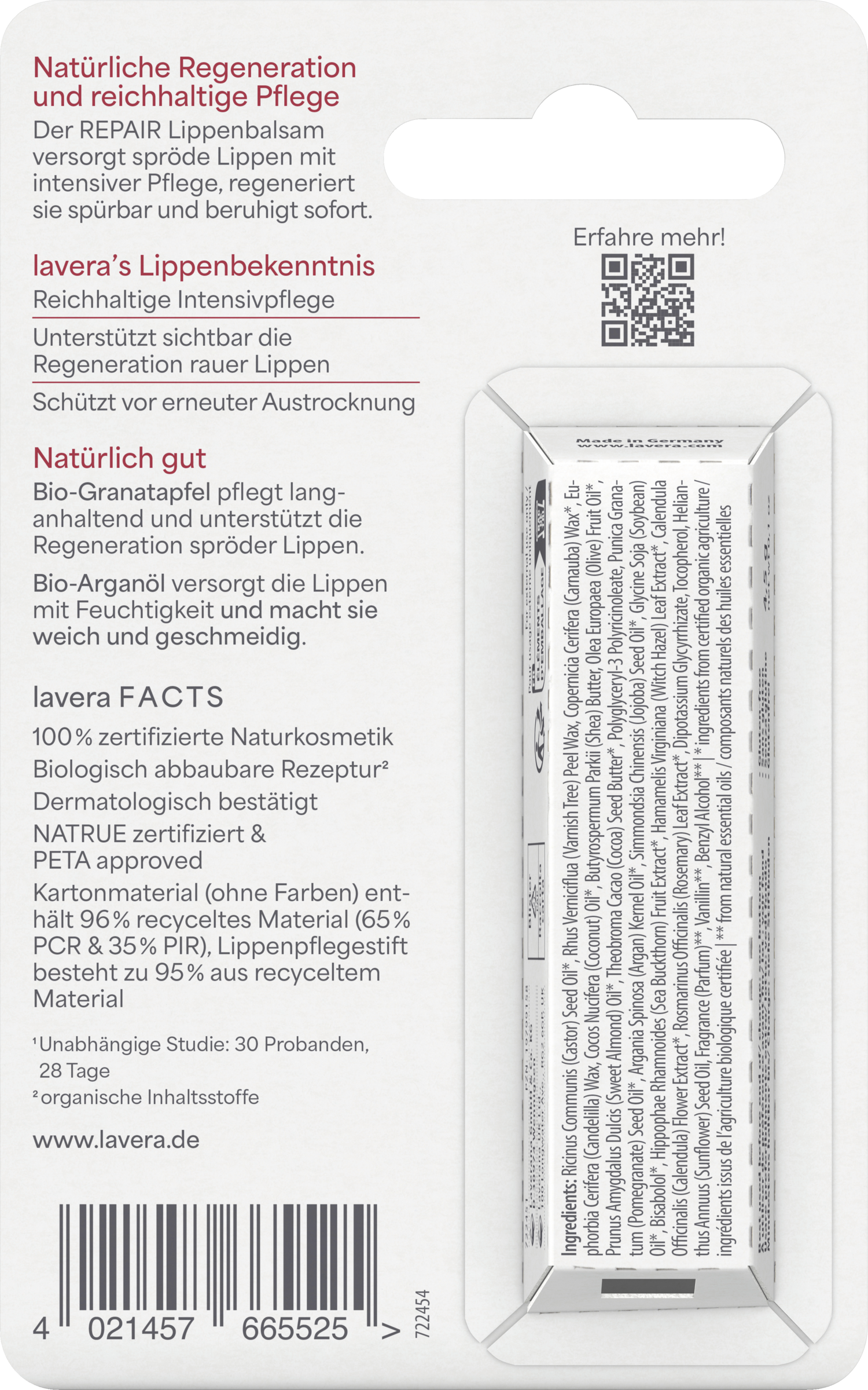 - pflegt langanhaltend und unterstützt die Regeneration spröder Lippen