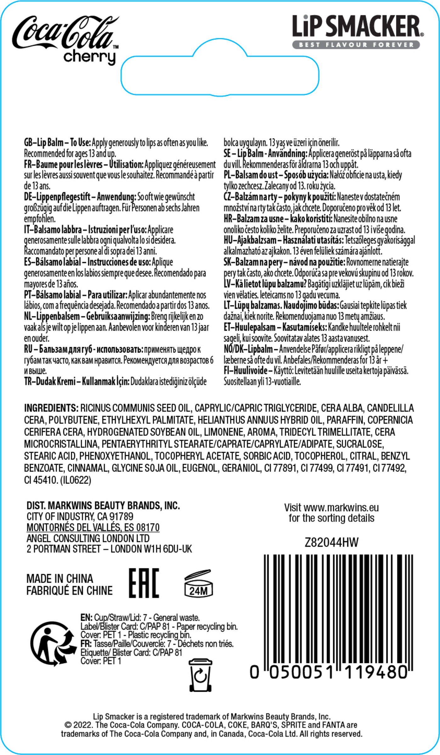 RICINUS COMMUNIS SEED OIL, CAPRYLIC/CAPRIC TRIGLYCERIDE, CERA ALBA, CANDELILLA CERA, POLYBUTENE, ETHYLHEXYL PALMITATE, HELIANTHUS ANNUUS HYBRID OIL, PARAFFIN, AROMA, COPERNICIA CERIFERA CERA, HYDROGENATED SOYBEAN OIL, LIMONENE, TRIDECYL TRIMELLITATE, CITRUS LIMON PEEL OIL, CERA MICROCRISTALLINA, PENTAERYTHRITYL STEARATE/CAPRATE/CAPRYLATE/ADIPATE, STEARIC ACID, SUCRALOSE, PHENOXYETHANOL, TOCOPHERYL ACETATE, SORBIC ACID, BENZYL BENZOATE, PINENE, TERPINEOL, TOCOPHEROL, CITRAL, TERPINOLENE, VANILLIN, ALPHA-TERPINENE, CINNAMAL, GLYCINE SOJA OIL, GERANYL ACETATE, GERANIOL, BETA-CARYOPHYLLENE, EUGENOL, LINALOOL, BENZYL ALCOHOL, CI 77891, CI 77491, CI 77492, CI 77499, CI 45410. (IL0225)