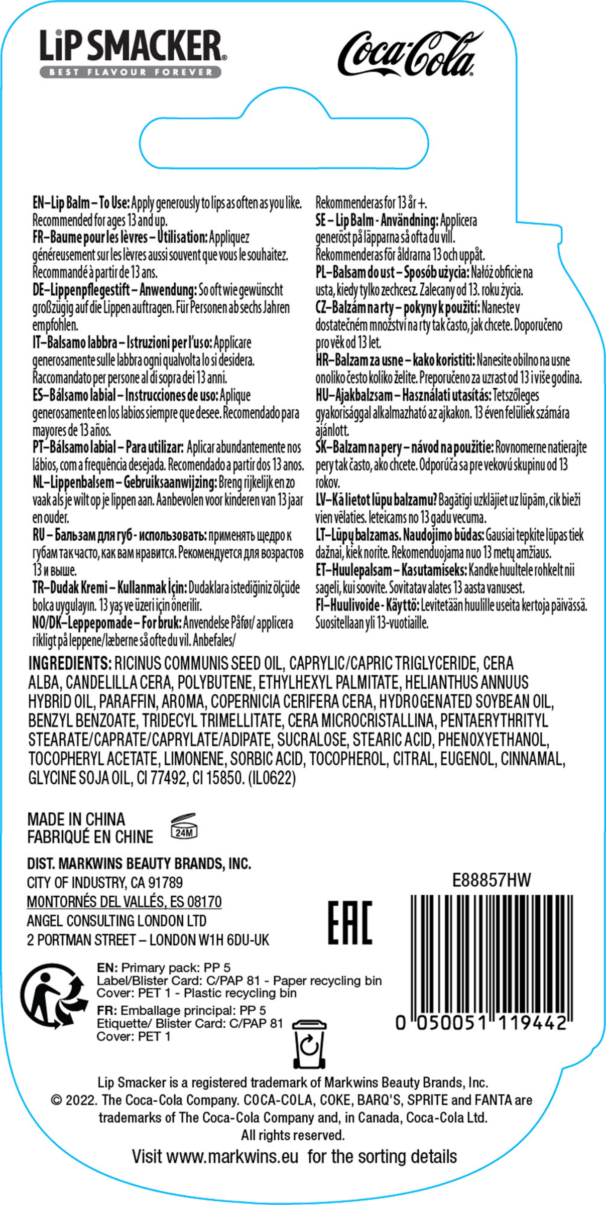 Coca Cola: RICINUS COMMUNIS SEED OIL, CAPRYLIC/CAPRIC TRIGLYCERIDE, CERA ALBA, CANDELILLA CERA, POLYBUTENE, AROMA, ETHYLHEXYL PALMITATE, HELIANTHUS ANNUUS HYBRID OIL, PARAFFIN, COPERNICIA CERIFERA CERA, HYDROGENATED SOYBEAN OIL, BENZYL BENZOATE, TRIDECYL TRIMELLITATE, CERA MICROCRISTALLINA, PENTAERYTHRITYL STEARATE/CAPRATE/CAPRYLATE/ADIPATE, STEARIC ACID, SUCRALOSE, PHENOXYETHANOL, TOCOPHERYL ACETATE, LIMONENE, SORBIC ACID, VANILLIN, CITRUS LIMON PEEL OIL, TERPINEOL, TOCOPHEROL, CITRAL, EUGENOL, CINNAMAL, PINENE, TERPINOLENE, ISOEUGENOL, BENZYL ALCOHOL, GLYCINE SOJA OIL, ALPHA-TERPINENE, CI 77492, CI 15850.