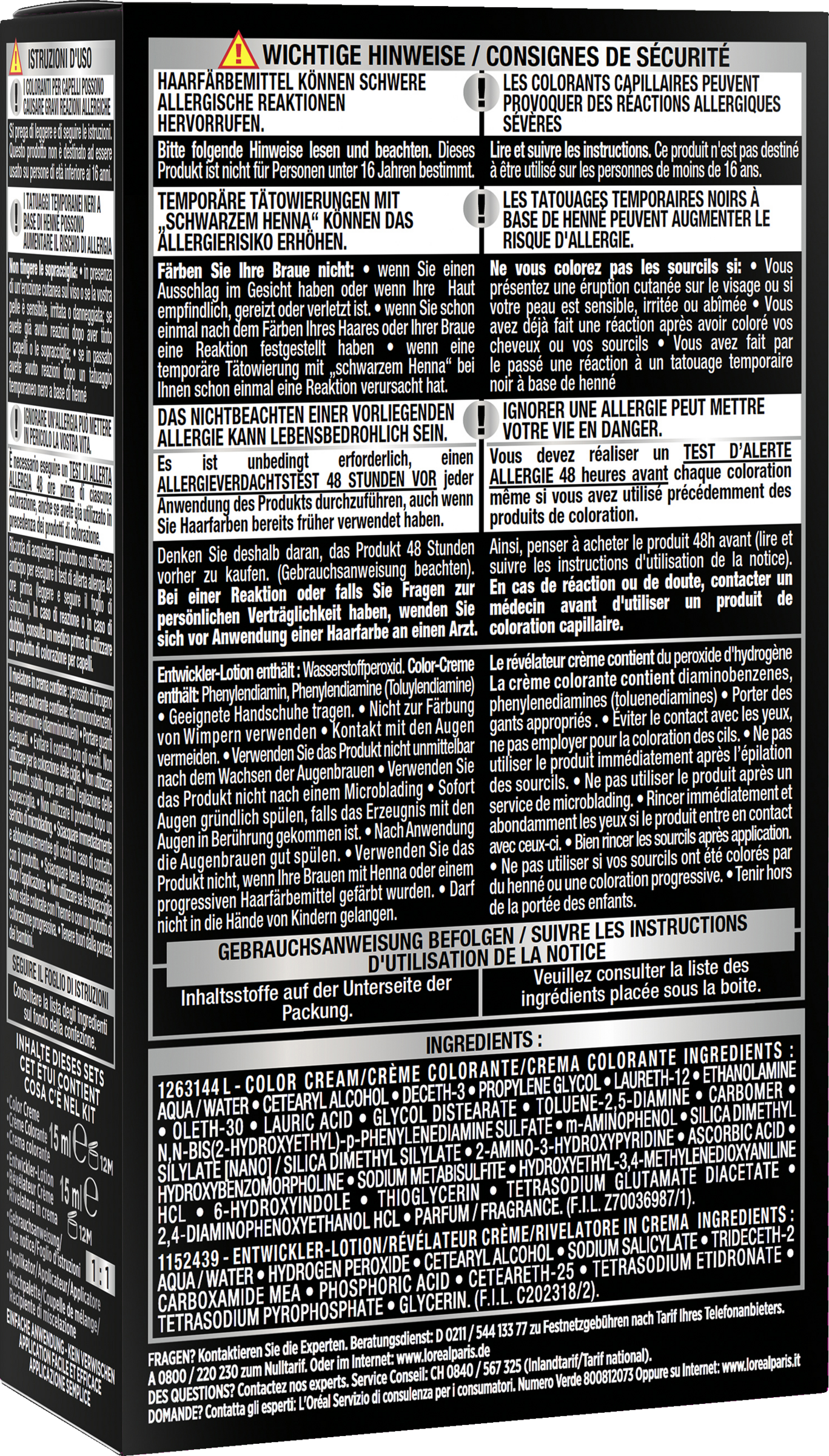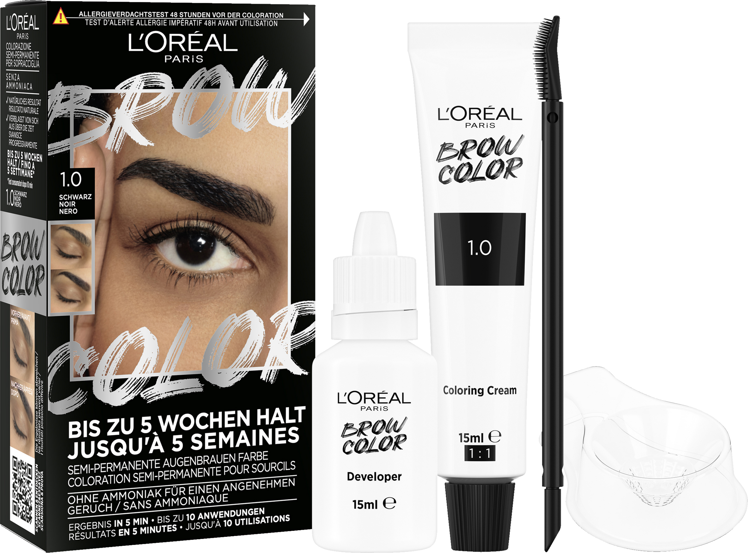 L'Oréal Paris Brow Color Augenbrauenfarbe, die bis zu 5 Wochen hält. Die ammoniakfreie Formel liefert Ergebnisse in nur 5 Minuten für einen strahlenden, perfekt gepflegten Look. Mit einer Hautverträglichkeit von 98% und einem präzisen Applikator von 91%.