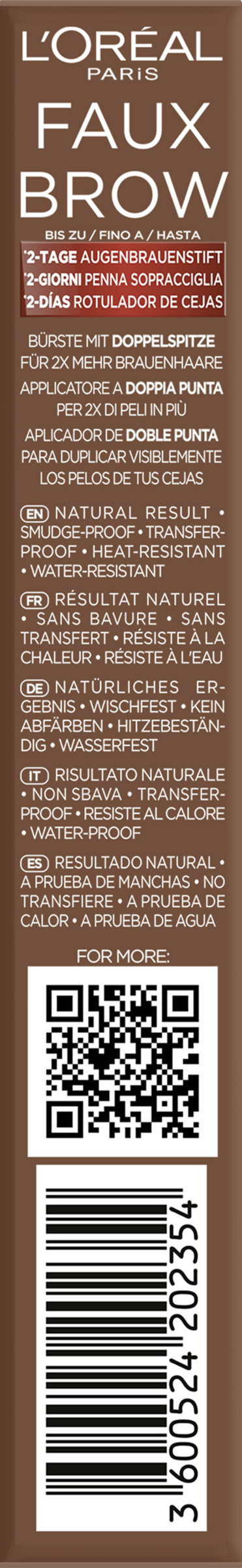 Für doppeltes Augenbrauenvolumen ohne abzufärben! Mit dem Infaillible Faux Brow Augenbrauenstift von L’Oréal Paris und seiner innovativen Doppelspitze lassen sich gleich zweimal soviele Augenbrauenhaare ziehen. Dank der 0,01mm feinen Doppelspitze und der angenehmen Formel werden volle Augenbrauen perfekt imitiert und in Szene gesetzt – bis zu 2 Tage lang! Die semi-permanente Formel verschmilzt förmlich mit den Brauenhaaren und hält äußeren Einflüssen bis zu 2 Tage lang stand, sodass selbst Schweiß, Hitze und Wasser ihr nichts anhaben können.
