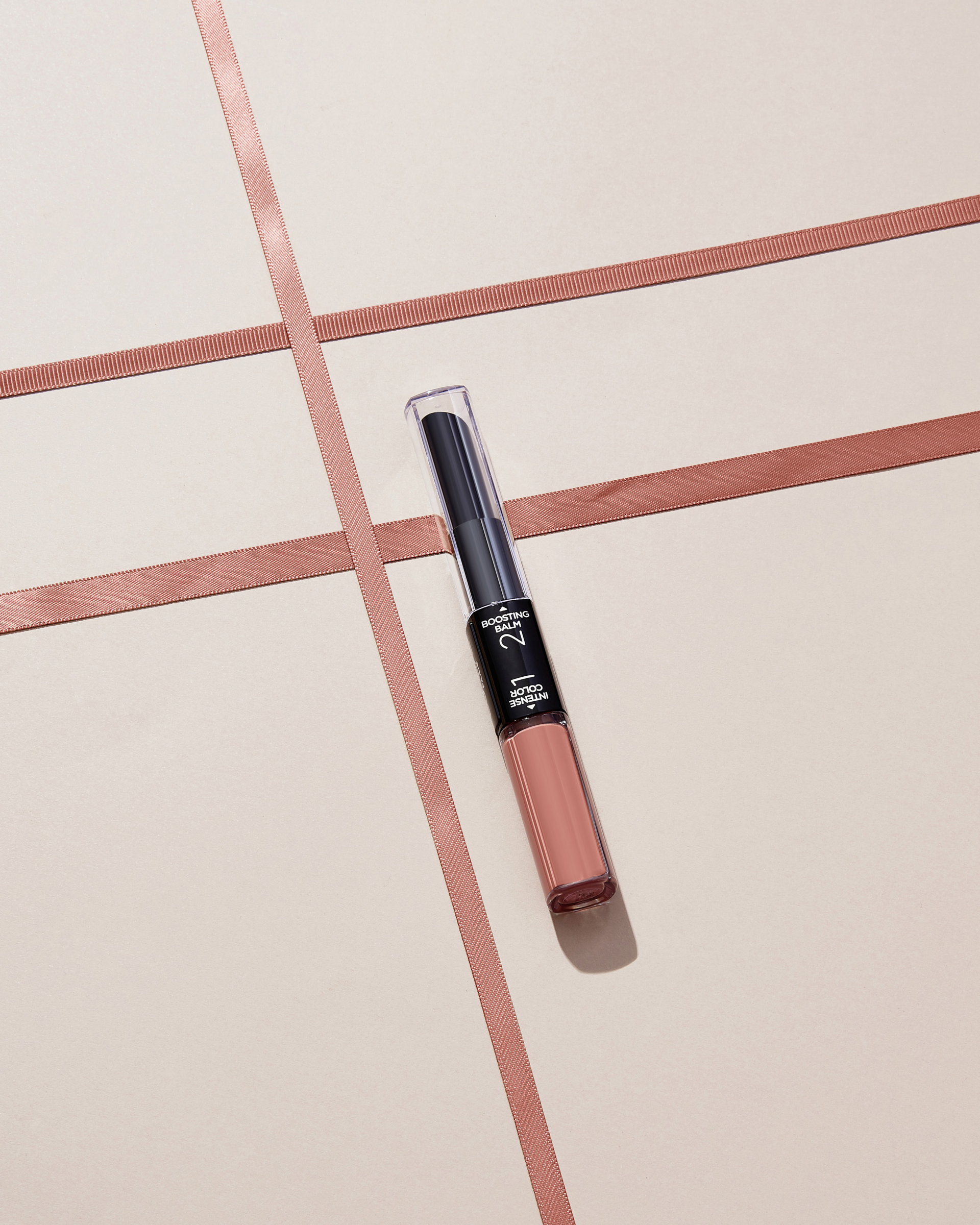 Lippenstift in zwei Schritten auftragen: Schritt 1: Die intensive long-lasting Formel auftragen und trocknen lassen. Schritt 2: Den feuchtigkeitsspendenden Balm auftragen.