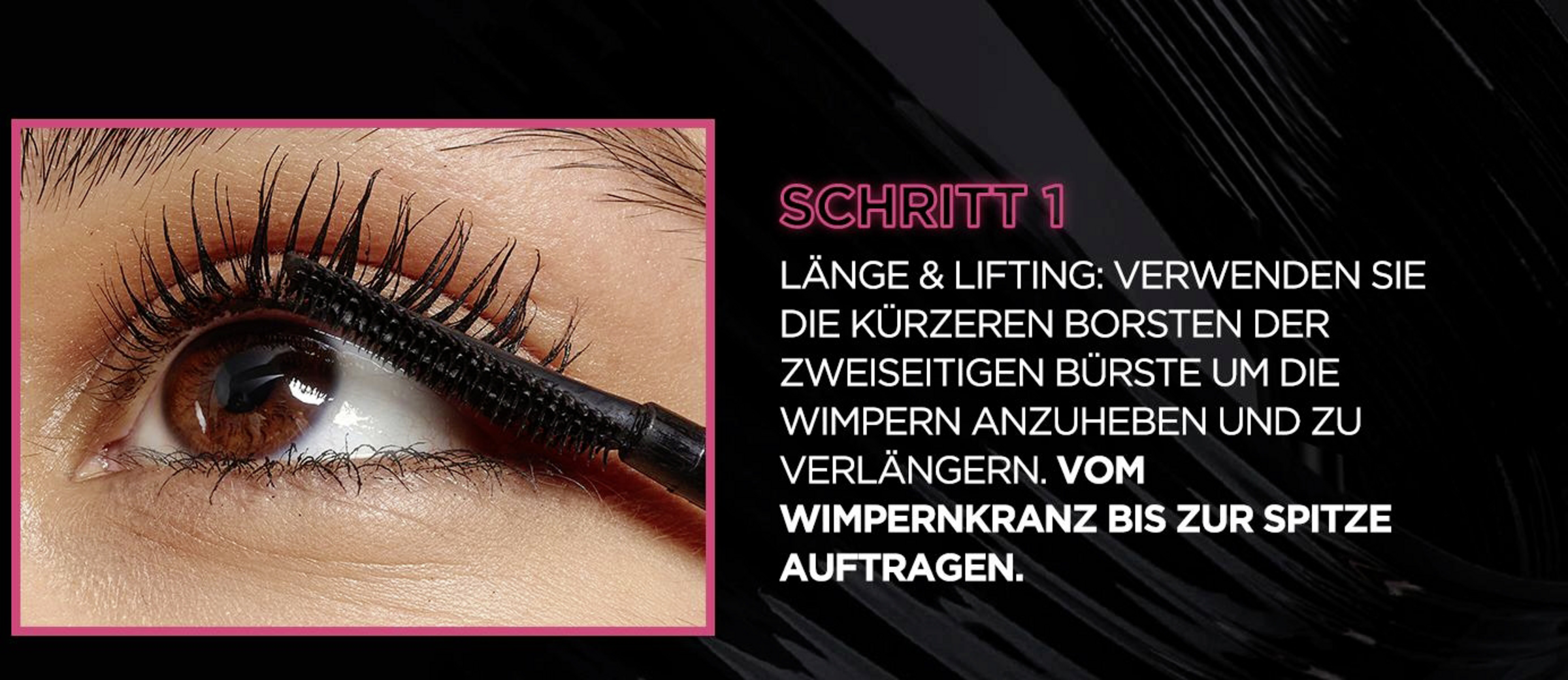 - Step 1: Länge & Lifting: Verwenden Sie die kürzeren Borsten der zweiseitigen Bürste, um die Wimpern anzuheben und zu verlängern. Vom Wimpernkranz bis zur Spitze auftragen.