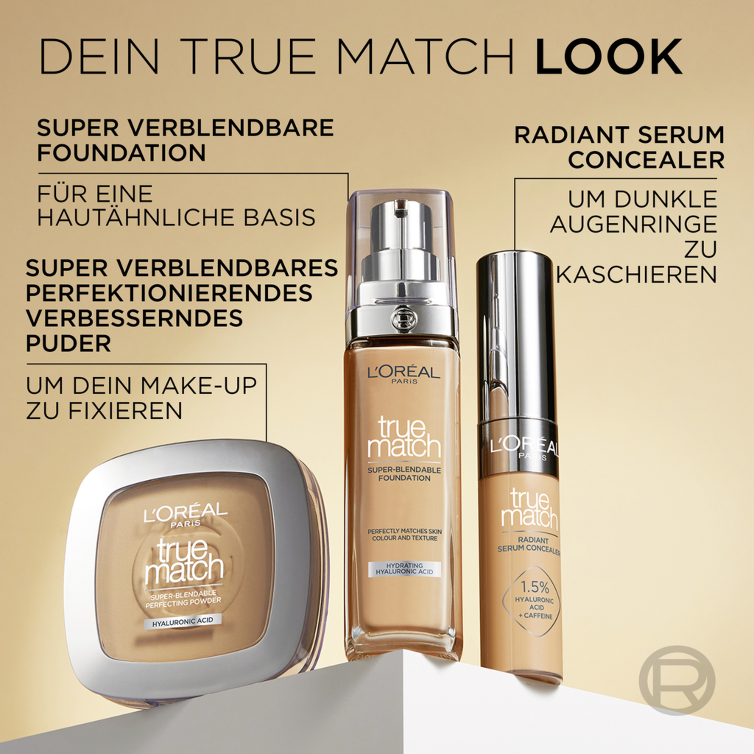 Das True Match Make-up von L‘Oréal Paris ist Pflege, Schutz und Foundation in einem. Das flüssige Make-up zaubert einen ebenmäßigen und natürlichen Teint im optimalen Farbton. Zusätzlich pflegt und schützt die Formel mit Hyaluron und Aloe Vera die Haut und verbessert das Hautbild. Die Formel ist vegan und somit ohne Inhaltsstoffe tierischen Ursprungs. Dank der innovativen Micro-Match-Technologie der Foundation verschmilzt die ultra-leichte Textur mit der Haut. Die Foundation optimiert optisch sowohl den Hautton als auch die Hautstruktur. Dasfeuchtigkeitsspendende Make-up fühlt sich wunderbar geschmeidig an und passt sich Ihrem Hautunterton an.