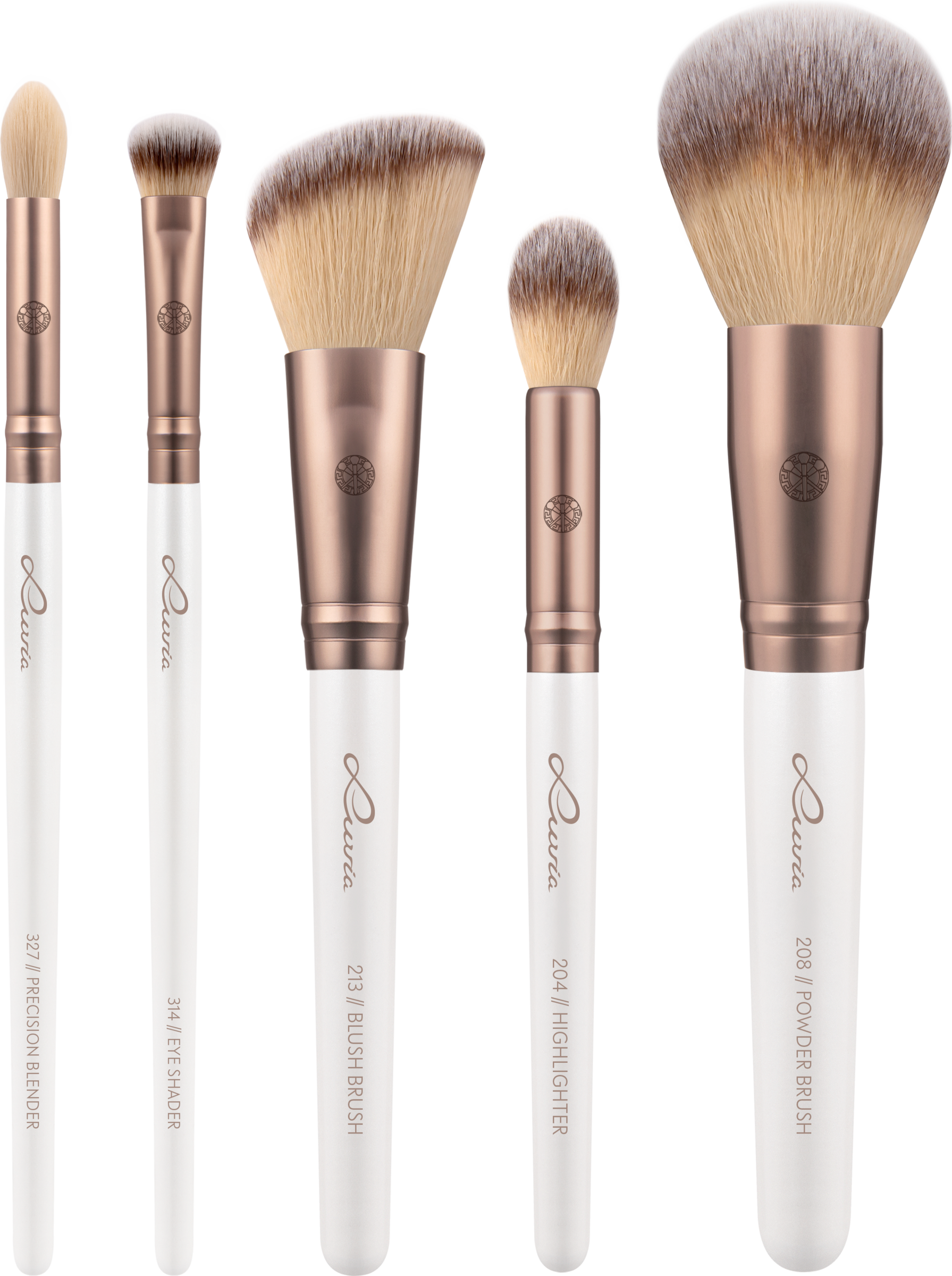 Der abgeschrägte Rouge-Pinsel eignet sich perfekt für die Wangenpartie. Der große Puderpinsel kann für gepresste oder lose Puder verwendet werden. Die beiden Augenpinsel sind optimal zum Auftragen und Verblenden von Lidschatten. Präzise Akzente setzt der kleine Highlighter-Pinsel.