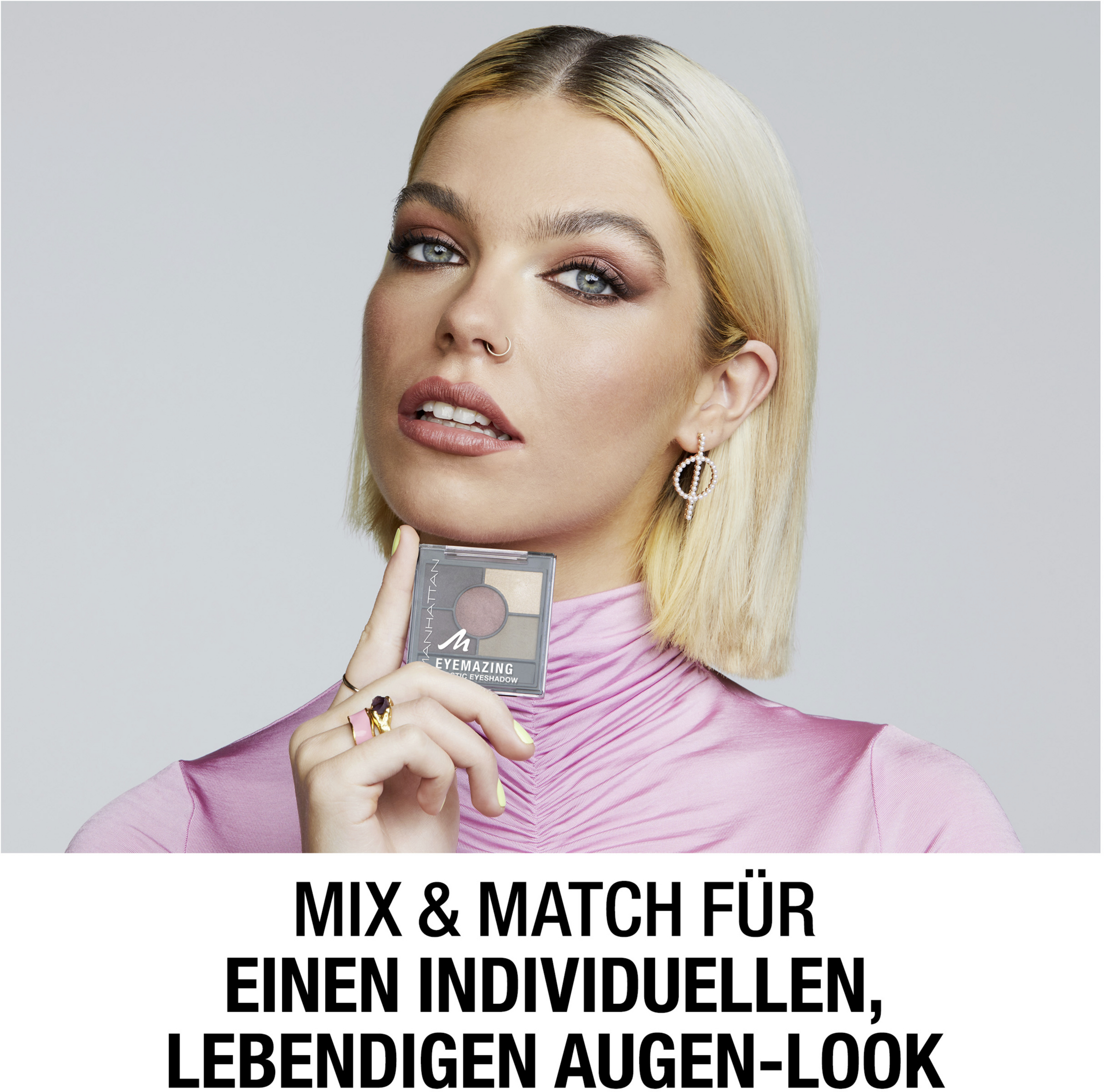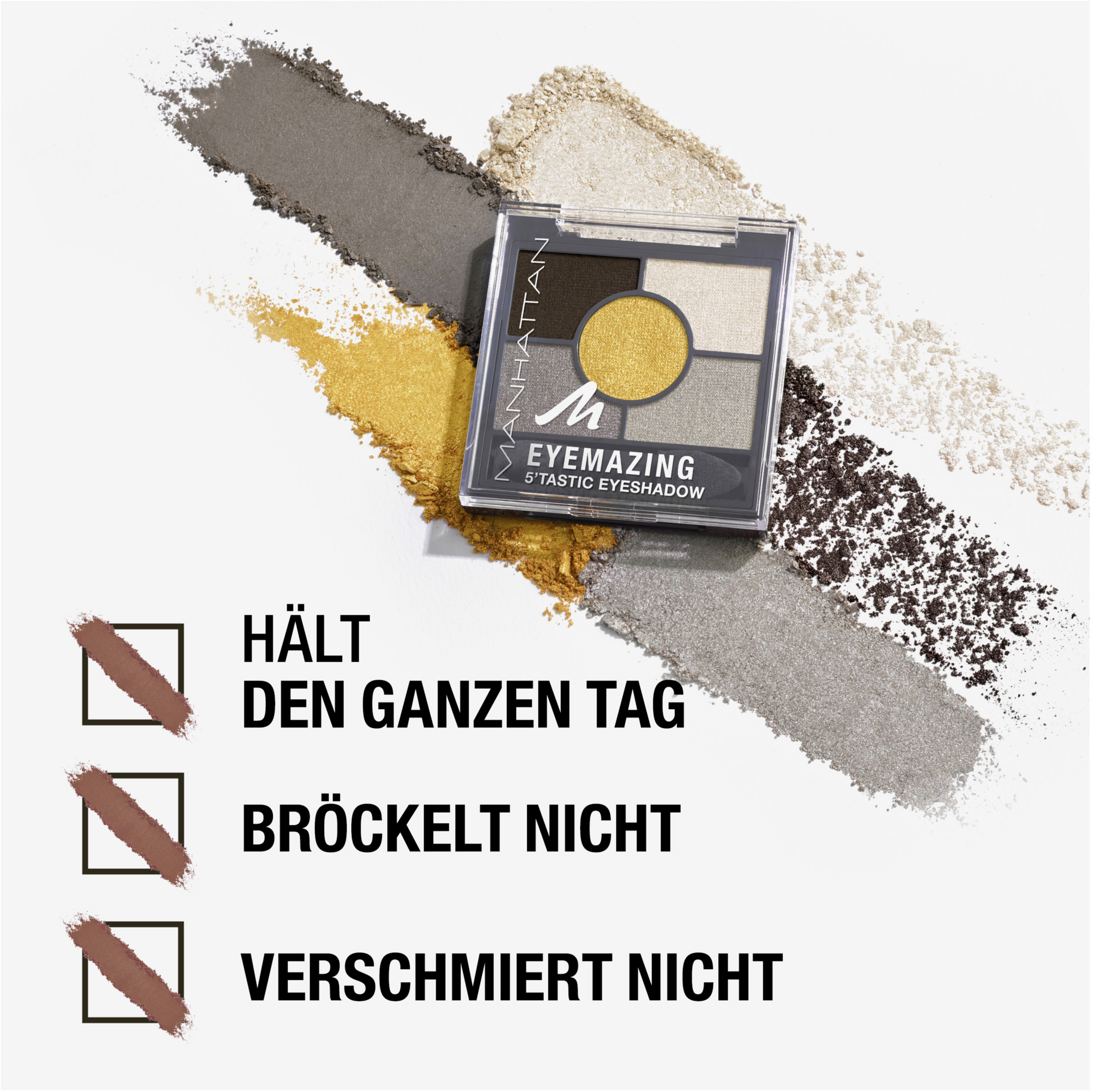 Trage den Manhattan Eyemazing 5'Tastic Eyeshadow mit einem Applikator oder den Fingerspitzen auf das Lid auf. Je nach gewünschtem Look kannst du verschiedene Töne kombinieren.