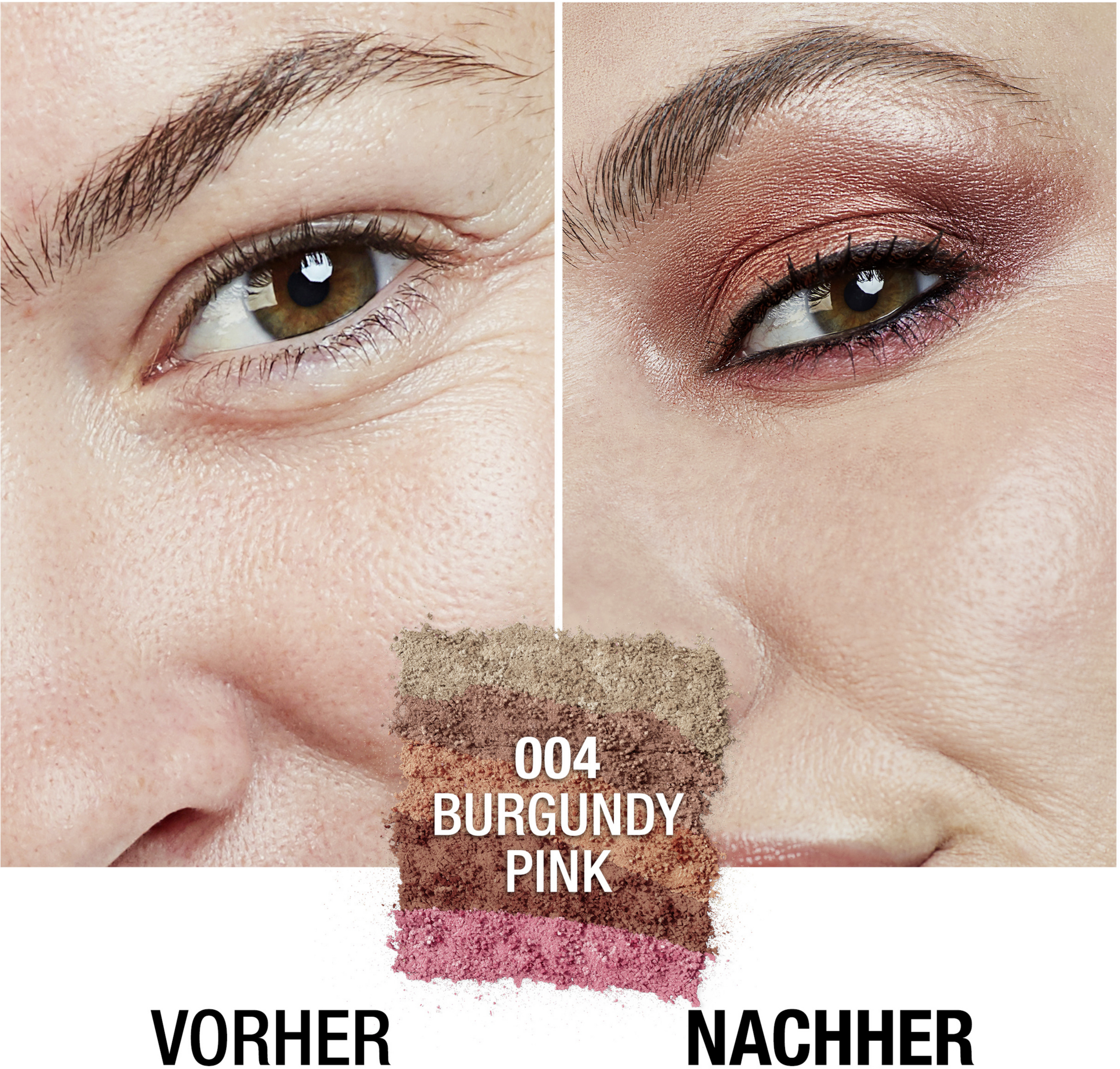 Manhattan Eyemazing 5'Tastic Eyeshadow Fb. 004 Burgundy Pink: Fünf samtige Lidschattentöne in einer Palette für einen besonderen Look. Intensive, langanhaltende Farbe sorgt für einen eindrucksvollen Augenaufschlag – den ganzen Tag. Der Eyemazing 5'Tastic Eyeshadow ist zudem wischfest und setzt sich nicht in Falten ab. Dank reflektierender Pigmente mit hoher Deckkraft gelingt ein glänzender Auftritt in jedem Licht. Die Intensität der Augenfarbe kann individuell betont werden: Den Lidschatten einfach mit einem nassen oder trockenen Applikator oder mit den Fingerspitzen auf das Lid aufgetragen. Je nach gewünschtem Look können verschiedene Töne kombiniert werden. Für jede Augenfarbe ist eine passende Palette erhältlich — für strahlende Augenblicke mit individueller Note.