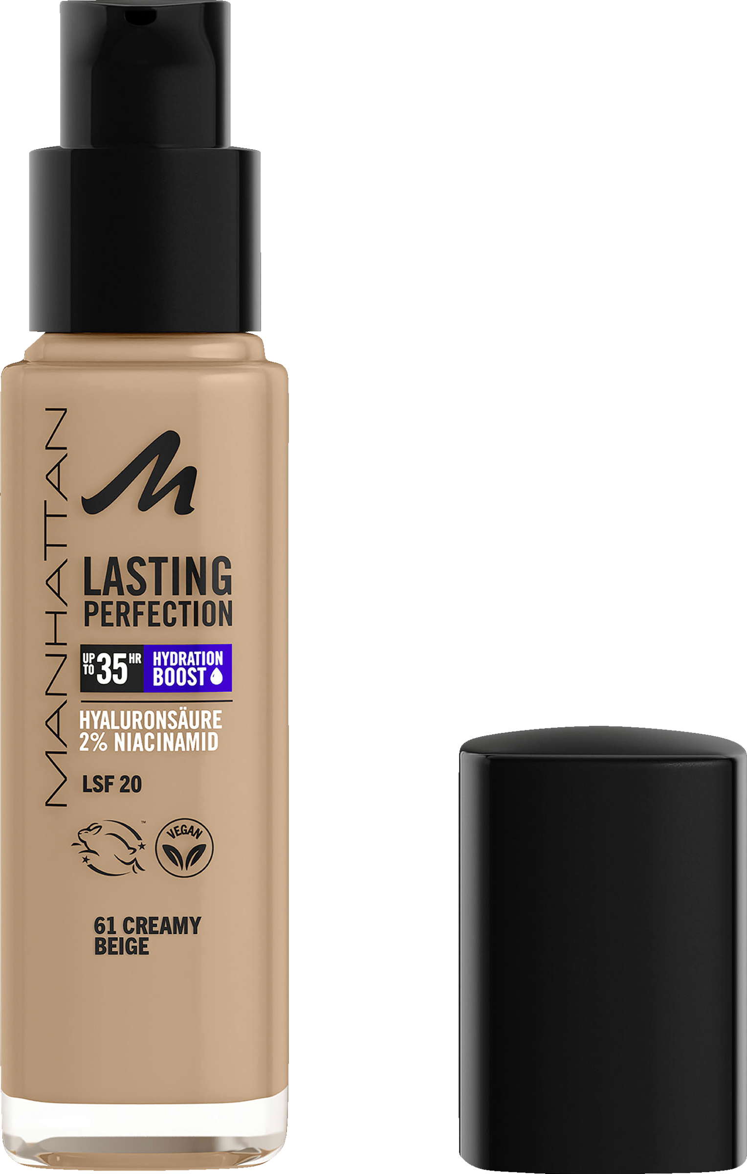 Wie wär‘s mit einem Make-up, das bis zu 35 Stunden hält? Gibt’s nicht? Gibt’s doch! Das Manhattan Lasting Perfection 35 HR Make-up ist ein ultra-langanhaltendes Flüssig-Make-up, das nicht nur hohe Deckkraft bietet, sondern die Haut über die gesamte Tragedauer mit Feuchtigkeit versorgt. Die cleane, atmungsaktive Formel mit Hyaluronsäure und 2 % Niacinamid verstopft die Poren nicht und stärkt die Hautbarriere gegen äußere Einflüsse. Dank LSF 20 wird die Haut außerdem gegen schädliche UV-Strahlung geschützt. Das Manhattan Lasting Perfection 35 HR Make-up ist absolut transferresistent und hält auch extremen Belastungen stand. Neben Sesame ist es in 11 weiteren natürlichen Farbnuancen erhältlich – das perfekte Match für einen langanhaltend strahlenden Teint.