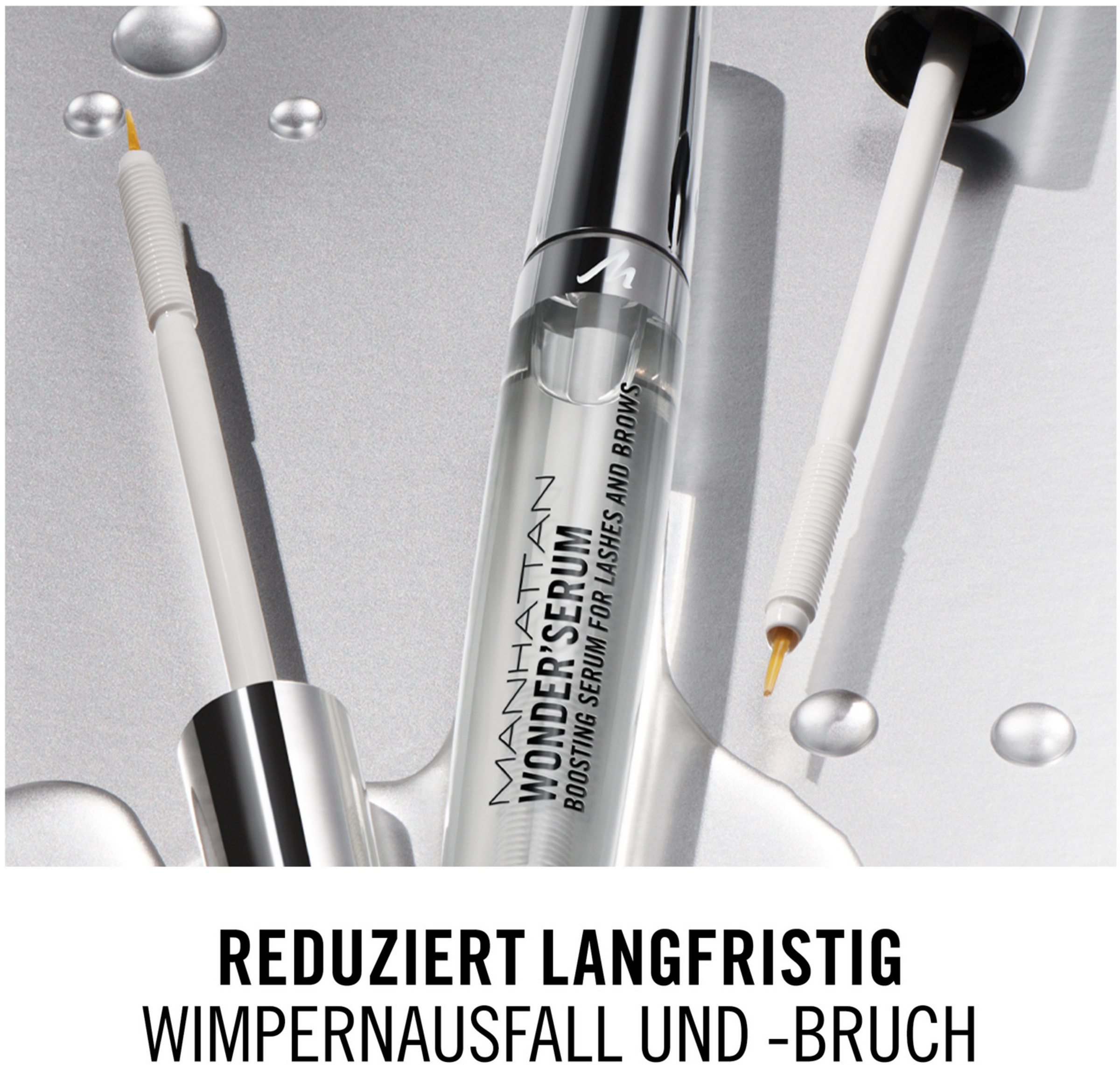 Längere, vollere und dichtere Wimpern? Das Manhattan Wonder Lash & Brow Serum revitalisiert die Wimpern auf natürlichem Weg und regt ein gesundes Wimpernwachstum an. Inspiriert von Salons und klinisch getestet ist das Serum perfekt geeignet für Wimpern und Augenbrauen. Bambus-Extrakt, Biotin und Rizinusöl schützen vor Wimpernverlust und -bruch, kräftigen die Wimpern und fördern ihr Wachstum. Die Booster-Formel des pflegenden Serums ist mit einem nährstoffreichen Komplex aus Vitaminen, Proteinen und Peptiden angereichert: Nach nur vier Wochen Anwendung wirken die Wimpern dicker, kräftiger und bis zu 24 Prozent länger. Die sanfte Formel des Manhattan Wonder Lash & Brow Serum eignet sich auch für besonders sensible Augen. Dank der ultraschlanken Bürste gelingt die Anwendung einfach und sauber: Auf die ungeschminkten Wimpern auftragen und über Nacht einwirken lassen.
