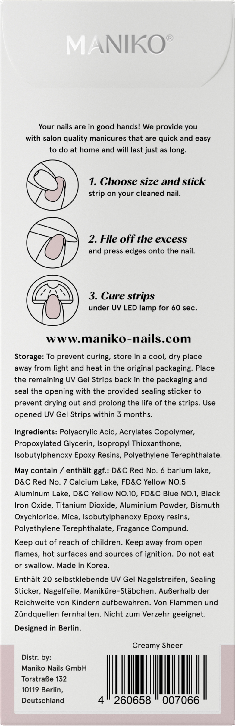 Maniko Nails® bieten eine echte Alternative zum Nagelsalon, einfach von zu Hause aus. Dank der ausgeklügelten UV Gel Strip Technologie gelingt Gel-Maniküre in Studioqualität schnell und unkompliziert. Einfach aufkleben, abfeilen, aushärten und die Welt erobern.