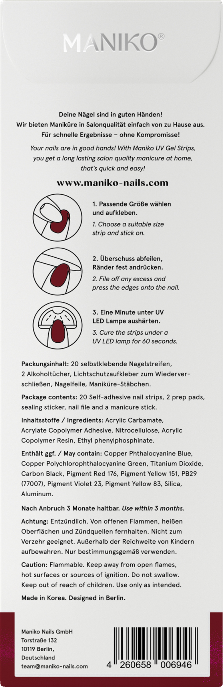 Maniko Nails® bietet dank der ausgeklügelten UV Gel Strip Technologie Gel-Maniküre in Studioqualität schnell und unkompliziert. Einfach aufkleben, abfeilen, aushärten.