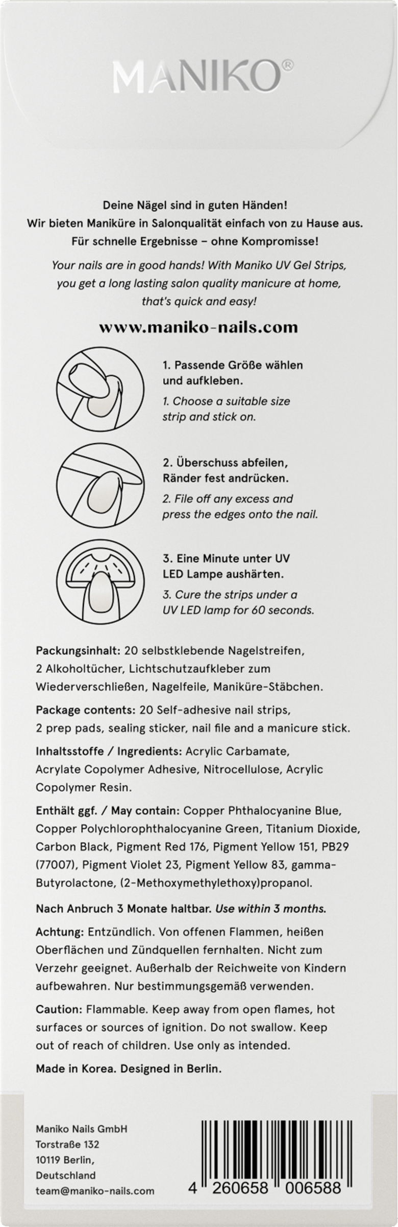 Maniko Nails® bietet dank der ausgeklügelten UV Gel Strip Technologie Gel-Maniküre in Studioqualität schnell und unkompliziert. Einfach aufkleben, abfeilen, aushärten.