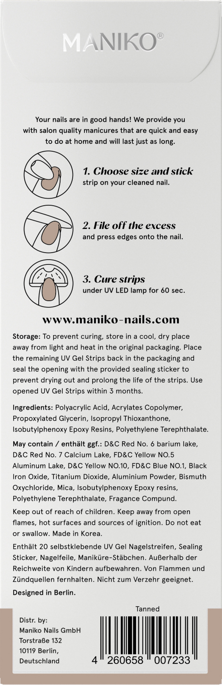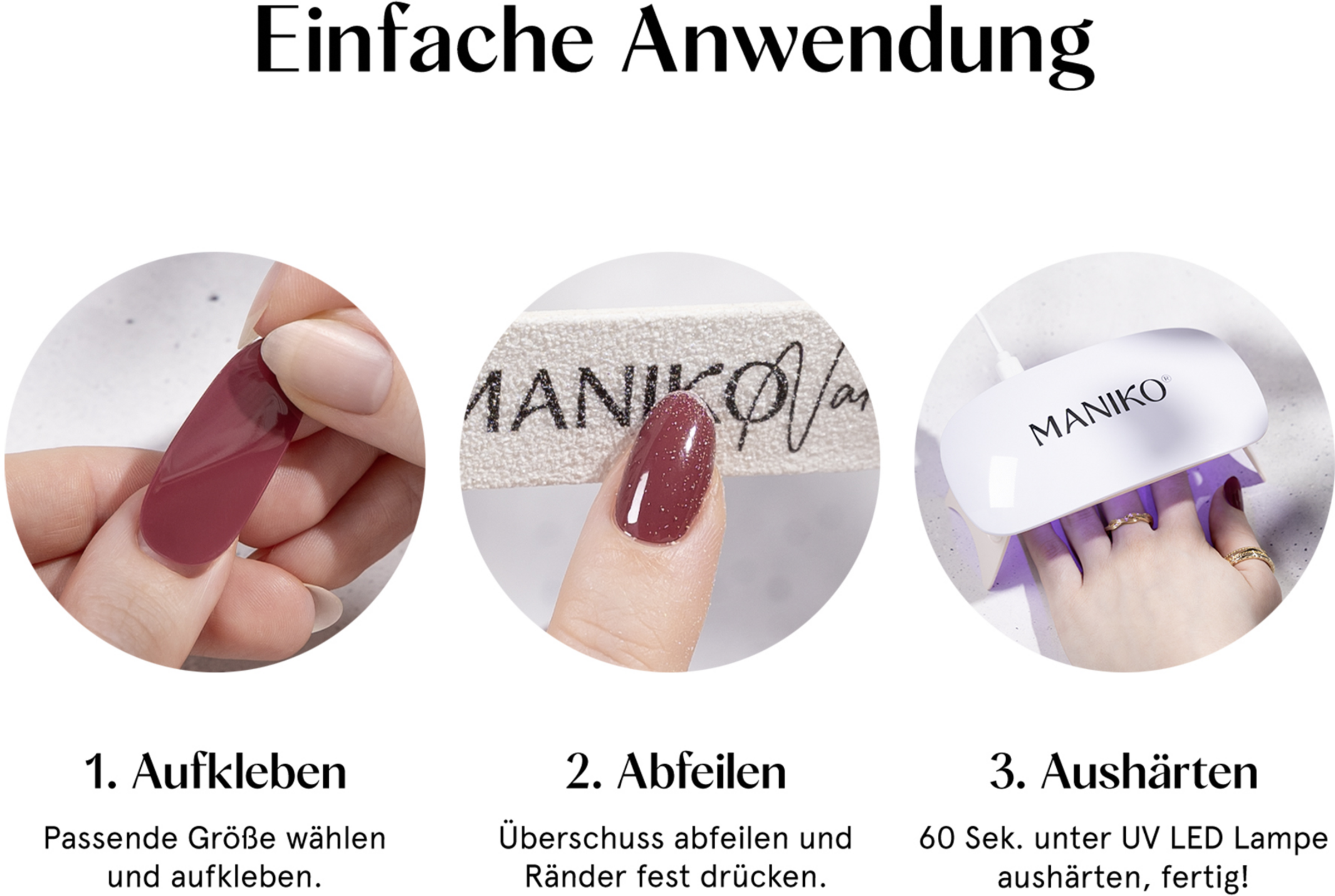 Maniko Nails® bieten eine echte Alternative zum Nagelsalon, einfach von zu Hause aus. Dank der ausgeklügelten UV Gel Strip Technologie gelingt Gel-Maniküre in Studioqualität schnell und unkompliziert. Einfach aufkleben, abfeilen, aushärten und die Welt erobern.