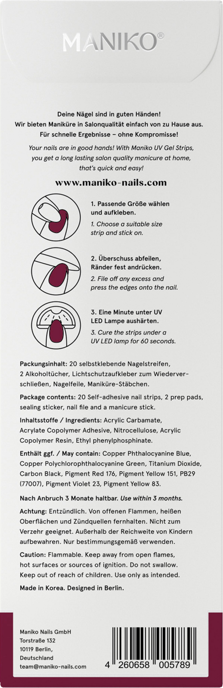 Maniko Nails® bietet dank der ausgeklügelten UV Gel Strip Technologie Gel-Maniküre in Studioqualität schnell und unkompliziert. Einfach aufkleben, abfeilen, aushärten.