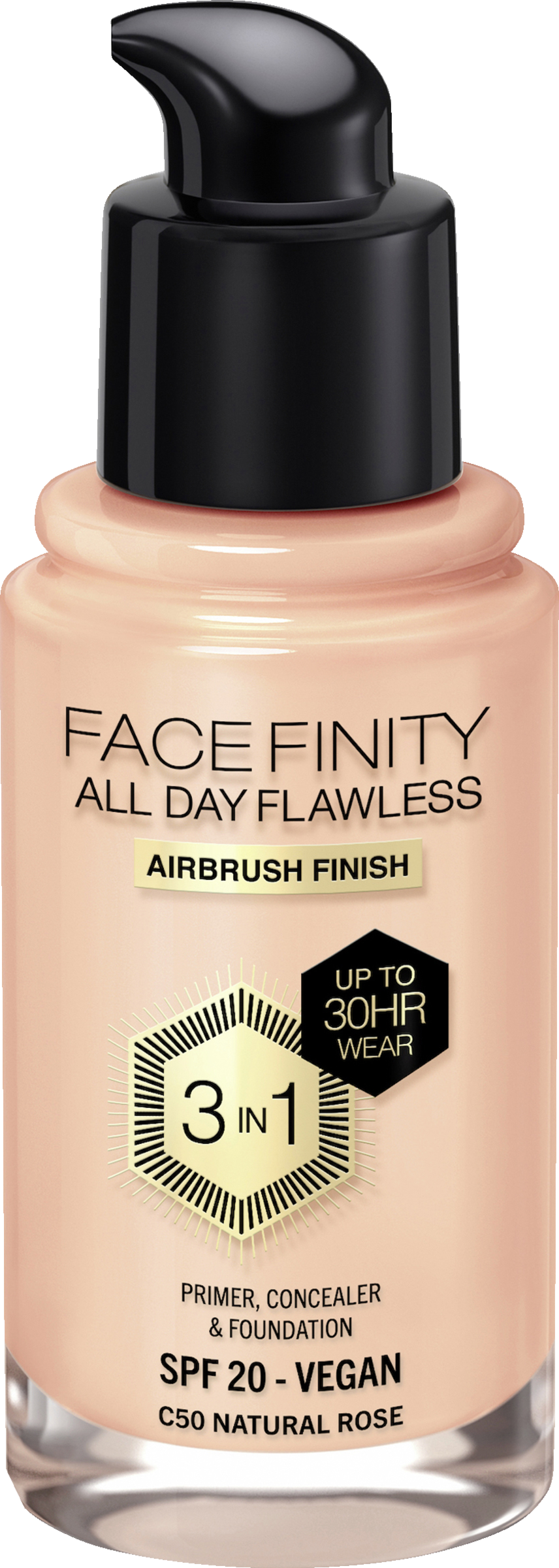 Für einen makellosen, langanhaltenden Look gibt es die Max Factor Facefinity All Day Flawless Make-up jetzt mit cleaner Formel. Das flüssige 3-in-1 Make-up, anzuwenden als Make-up, Primer und Concealer in einem, hält bis zu 30 Stunden und schützt mit LSF20 die Haut vor schädlichen UVA- und UVB-Strahlen sowie vor äußeren Einflüssen wie blauem Licht und Umweltverschmutzung und beugt damit der Hautalterung vor. Die vegane Formel mit perfekter Deckkraft kaschiert Rötungen und Unregelmäßigkeiten. Dieses weichzeichnende Make-up in Farbe C50 Natural Rose mit Airbrush-Finish ist wetterfest, wasserfest, hitzebeständig und feuchtigkeitsbeständig. Die Flexi-Hold-Technologie passt sich jeder Haut an und sorgt für ein natürlich aussehendes, langanhaltendes Finish, das nicht abfärbt. Mit 9 unterschiedlichen Farbtönen ist für jeden Hauttyp der perfekte Farbton verfügbar. Entfalte dein Potential.