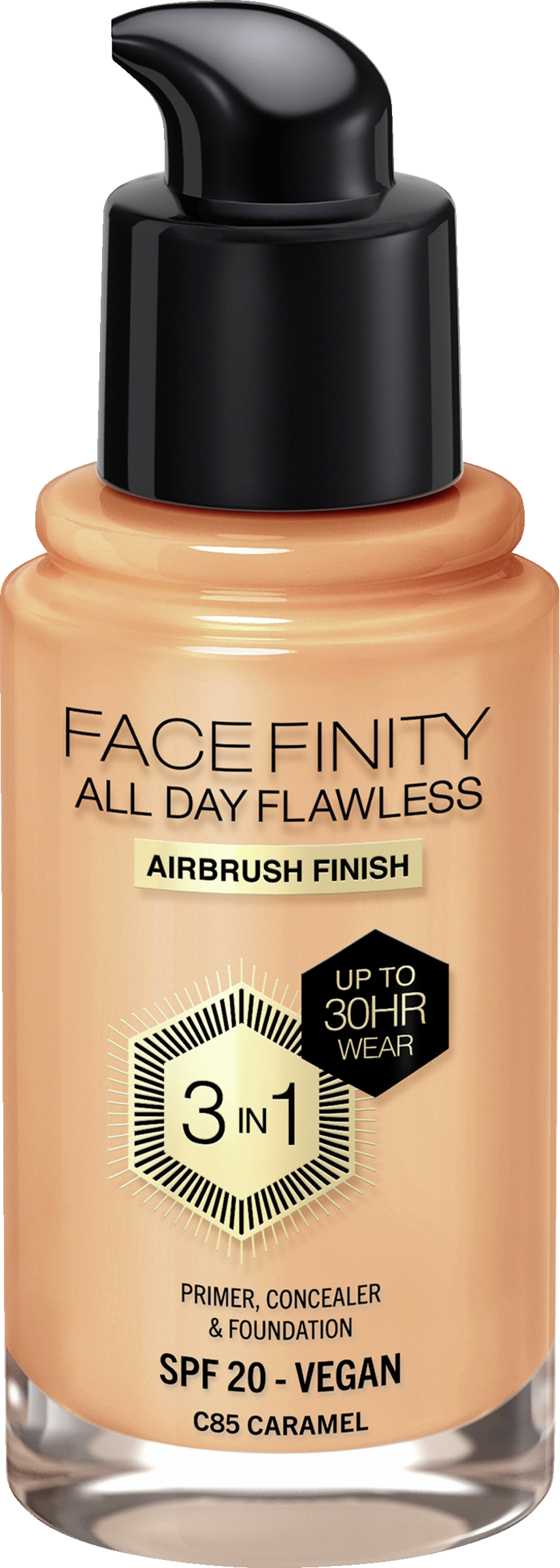 Für einen makellosen, langanhaltenden Look gibt es die Max Factor Facefinity All Day Flawless Make-up jetzt mit cleaner Formel. Das flüssige 3-in-1 Make-up, anzuwenden als Make-up, Primer und Concealer in einem, hält bis zu 30 Stunden und schützt mit LSF20 die Haut vor schädlichen UVA- und UVB-Strahlen sowie vor äußeren Einflüssen wie blauem Licht und Umweltverschmutzung und beugt damit der Hautalterung vor. Die vegane Formel mit perfekter Deckkraft kaschiert Rötungen und Unregelmäßigkeiten. Dieses weichzeichnende Make-up in Farbe C85 - Caramel mit Airbrush-Finish ist wetterfest, wasserfest, hitzebeständig und feuchtigkeitsbeständig. Die Flexi-Hold-Technologie passt sich jeder Haut an und sorgt für ein natürlich aussehendes, langanhaltendes Finish, das nicht abfärbt.