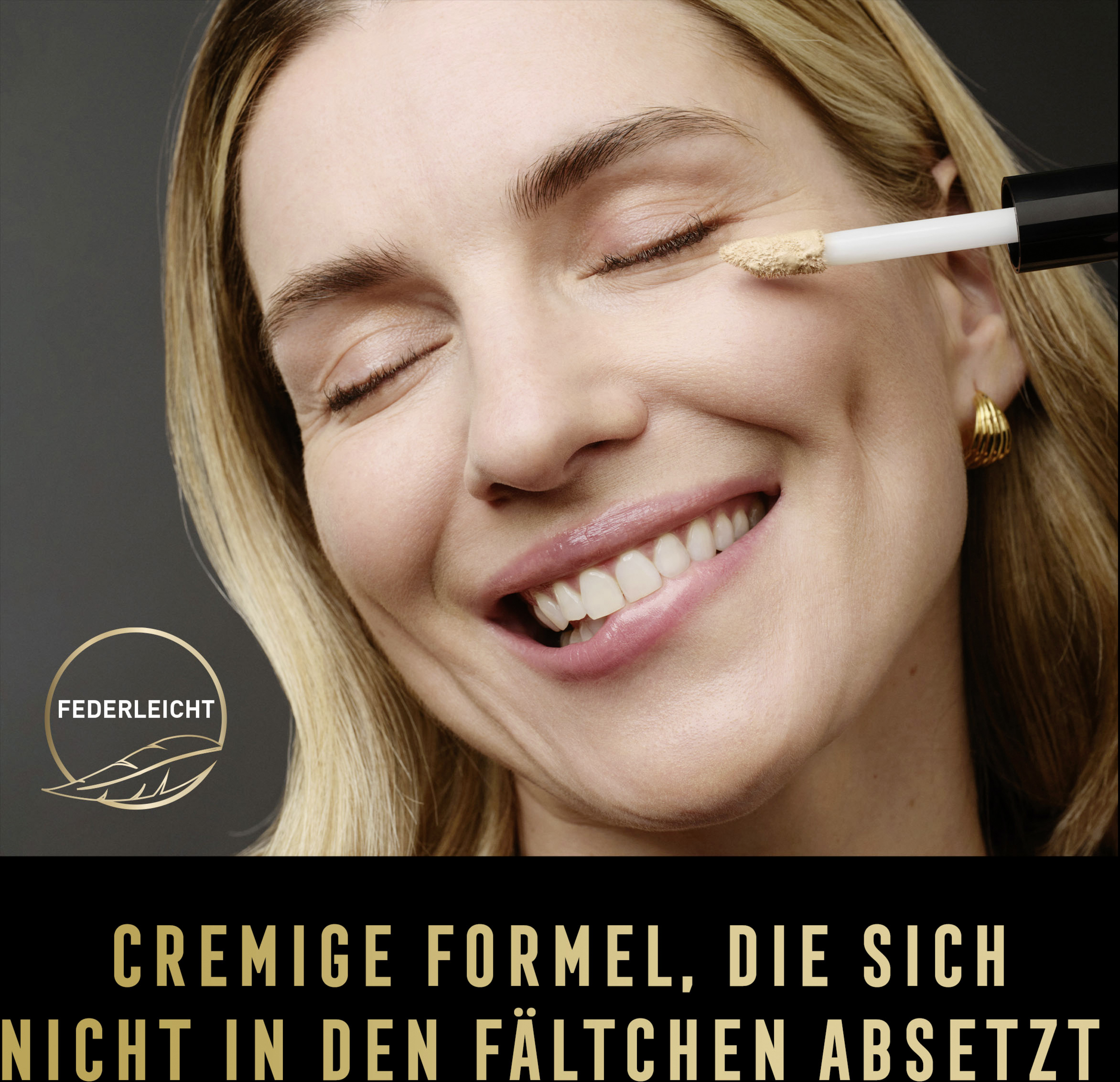 Step 1: Um Augenringe zu kaschieren, mit dem Applikator einige Punkte unter den Augen setzen und diese mit dem Finger sanft in die Haut einklopfen und an den Rändern verblenden.