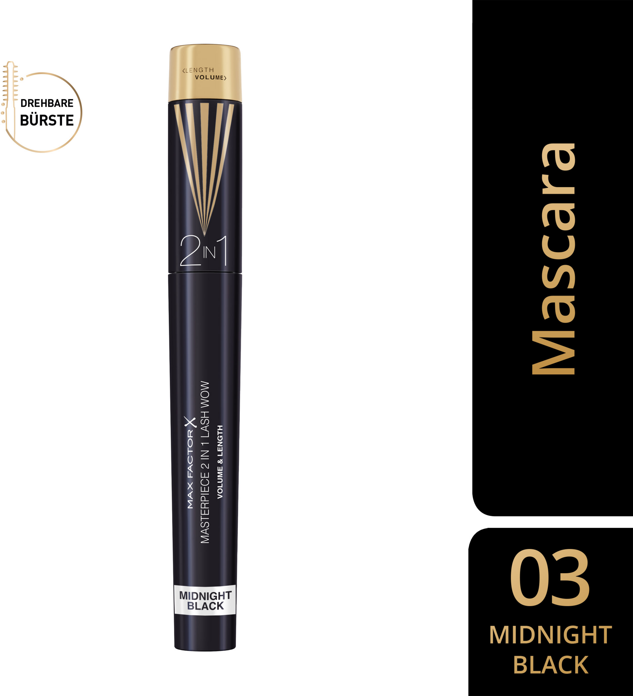 Die Max Factor Masterpiece 2-in-1 Lash WOW Mascara Midnight Black schenkt den Wimpern Volumen und maximale Länge in einer pflegenden, wischfesten Mascara ohne Klümpchenbildung und eignet sich insbesondere für trockene und empfindliche Augen. Die vegane Mascara beinhaltet natürliche Öle und antioxidatives Vitamin E, die das Wimpernhärchen lange feucht halten und ihm Geschmeidigkeit verleihen. Für Wimpern mit maximaler Länge und Volumen den Mascarastab einfach drehen und den Wimpern sowohl einen klassischen als auch dramatischen Look geben: trennen und verlängern oder anheben und voluminöser machen – du hast die Wahl! Das Lash Wow Original der Mascara lässt die Augen im Alltag strahlen und für einen dramatischen Augenaufschlag abends tuscht das Midnight Black die Wimpern in intensivem Nachtschwarz. Dafür sorgen ultramarinblaue und metallicschwarze Pigmente, die der Farbe Tiefe verleihen und den Wimpern ein spektakuläres Hochglanzfinish zaubern. Für einen Look, der andere zum Staunen bringt.