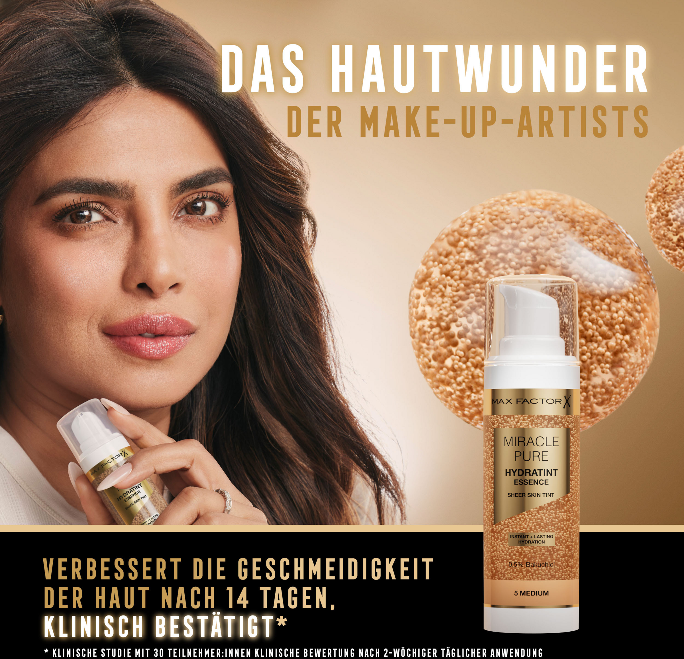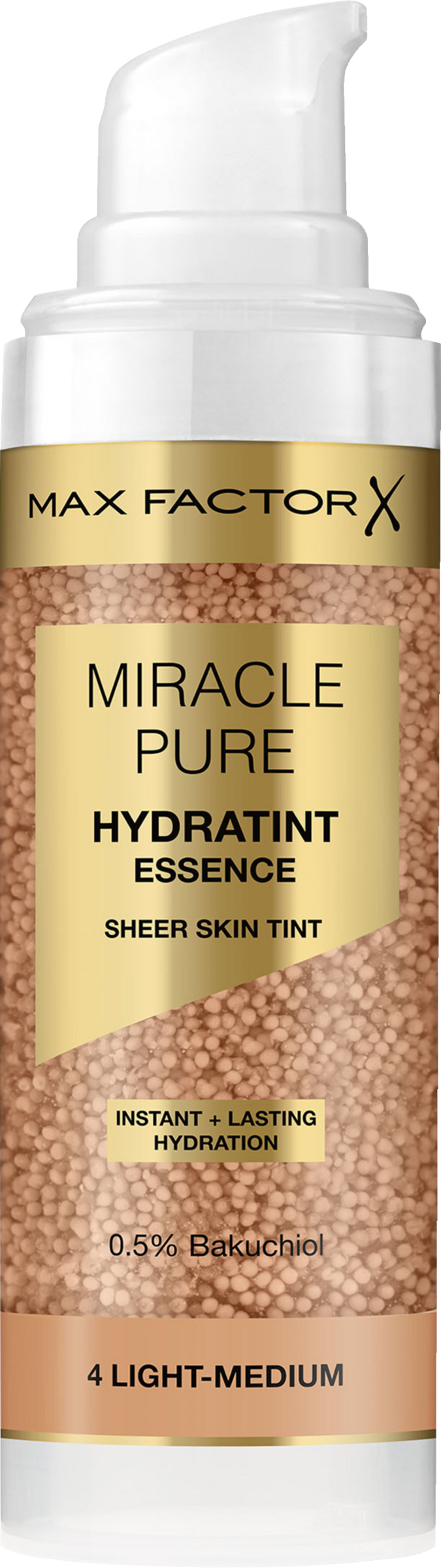 Ein Make-up, so erfrischend und pur wie klares Wasser: Max Factor Miracle Pure Hydratint Essence sorgt für einen extra Feuchtigkeitskick auf der Haut. Seine vegane, hautkühlende Formel ist zu 71 % wasserbasiert und mit pflegendem Bakuchiol angereichert. So spendet das Make-up bis zu 24 Stunden Feuchtigkeit und Frische. Die einzigartigen Mikro-Kapsel Pigmente werden vor dem Auftragen auf dem Handrücken vermischt und dadurch aktiviert. Die zarte Formel mit leichter Deckkraft lässt sich ganz einfach mit einem Make-up-Pinsel oder den Fingern verblenden und zaubert ein natürliches Finish mit lebendigem Glow. Bei regelmäßiger Anwendung verbessert sich die Geschmeidigkeit der Haut bereits nach 14 Tagen* sichtbar und spürbar**. Max Factor Miracle Pure Hydratint Essence kann als feuchtigkeitsspendende Basis unter dem Make-up oder allein für einen natürlichen Glow getragen werden. Erhältlich in sechs natürlichen, leichten Farbnuancen.