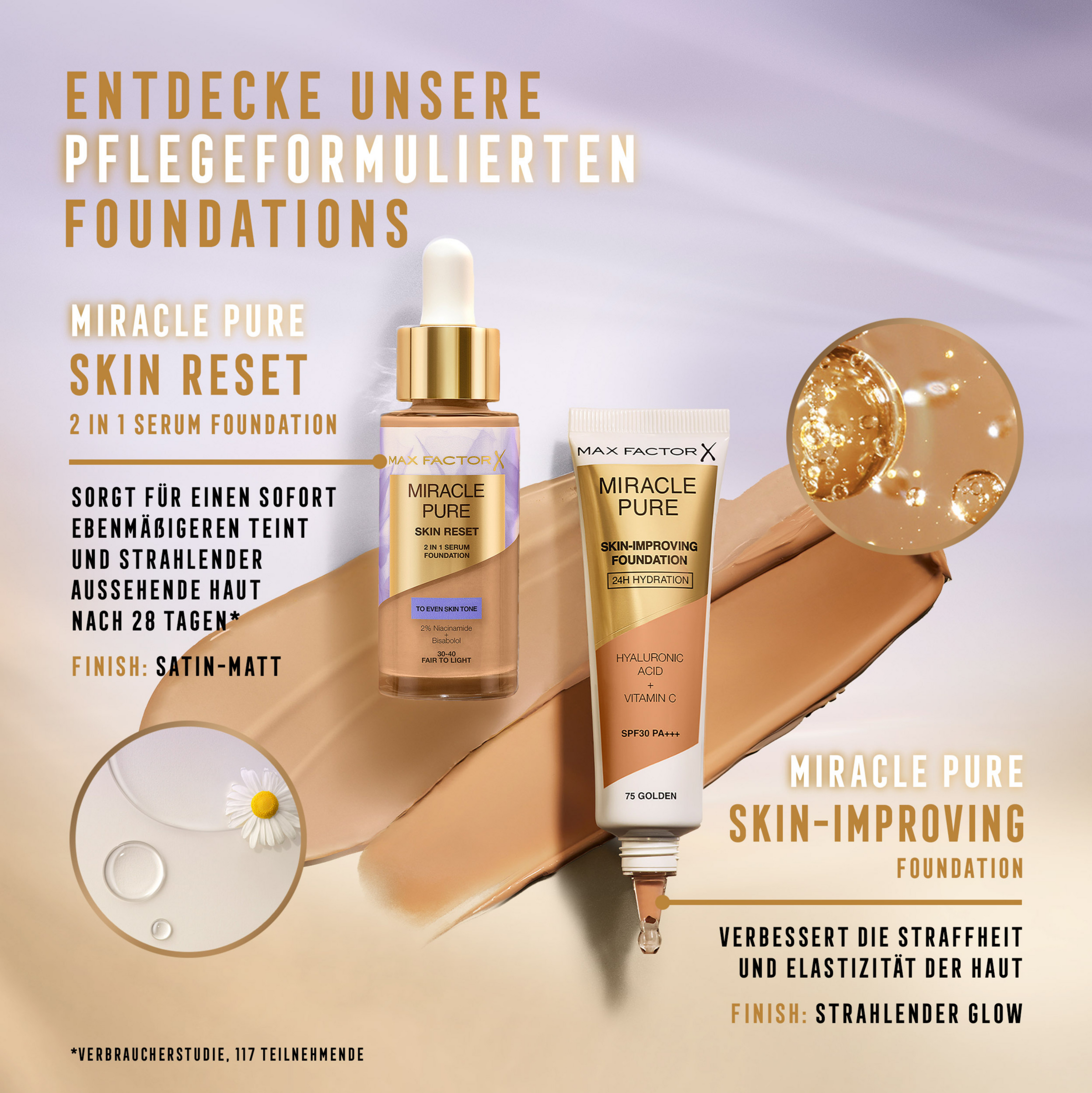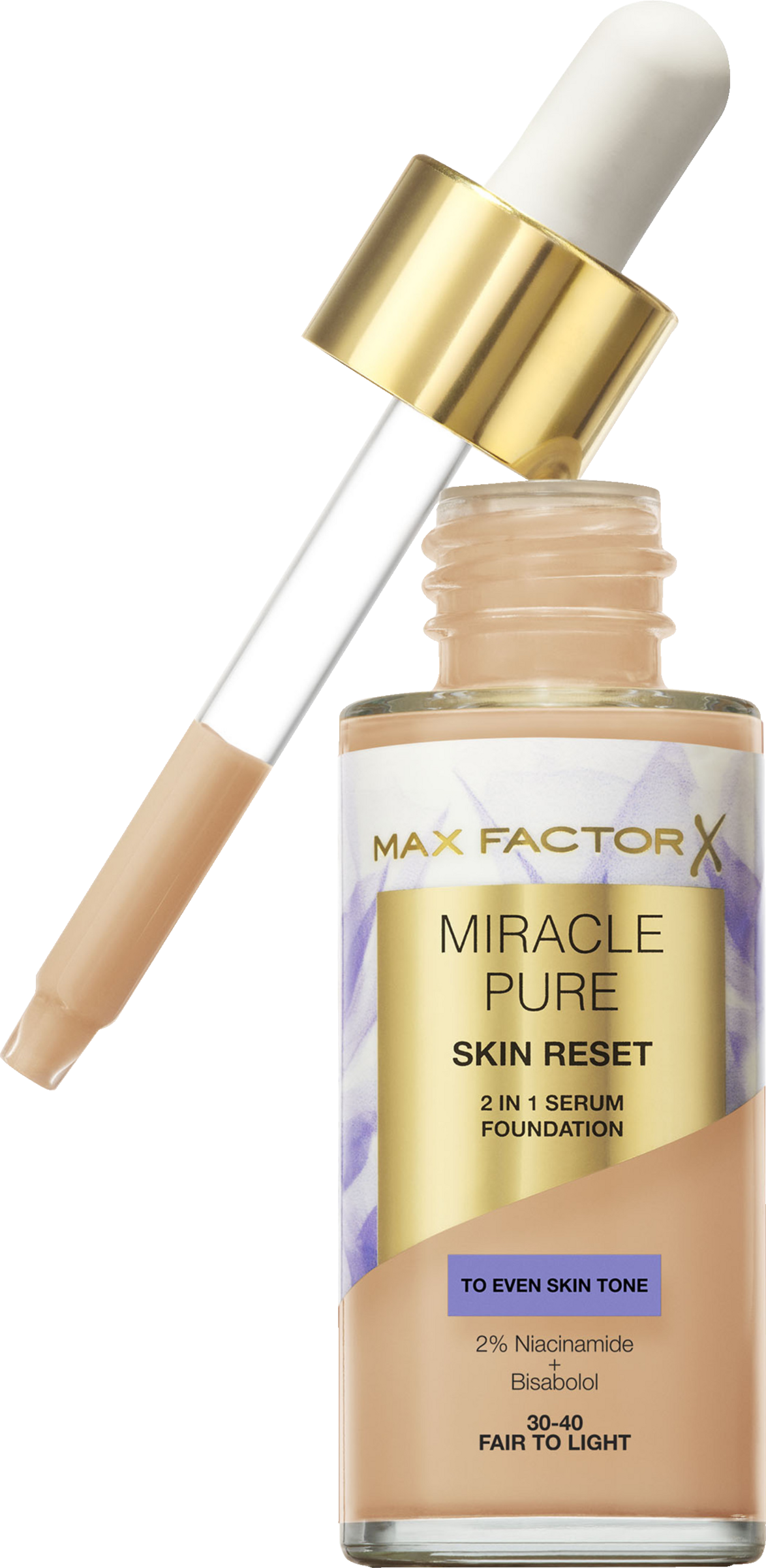 - Max Factor Miracle Pure Skin Reset Foundation: 2-in-1-Serumformel und flüssige Foundation mit ausgleichender Deckkraft, die für ein gleichmäßigeres Hautbild sorgt.