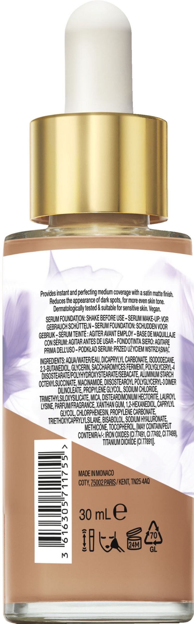 AQUA/WATER/EAU, DICAPRYLYL CARBONATE, ISODODECANE, 2,3-BUTANEDIOL, GLYCERIN, SACCHAROMYCES FERMENT, POLYGLYCERYL-4 DIISOSTEARATE/POLYHYDROXYSTEARATE/SEBACATE, ALUMINUM STARCH OCTENYLSUCCINATE, NIACINAMIDE, DIISOSTEAROYL POLYGLYCERYL-3 DIMER DILINOLEATE, PROPYLENE GLYCOL, SODIUM CHLORIDE, TRIMETHYLSILOXYSILICATE, MICA, DISTEARDIMONIUM HECTORITE, LAUROYL LYSINE, PARFUM/FRAGRANCE, XANTHAN GUM, 1,2-HEXANEDIOL, CAPRYLYL GLYCOL, CHLORPHENESIN, PROPYLENE CARBONATE, TRIETHOXYCAPRYLYLSILANE, BISABOLOL, SODIUM HYALURONATE, METHICONE, TOCOPHEROL, [MAY CONTAIN/PEUT CONTENIR/+/-: IRON OXIDES (CI 77491, CI 77492, CI 77499), TITANIUM DIOXIDE (CI 77891)].