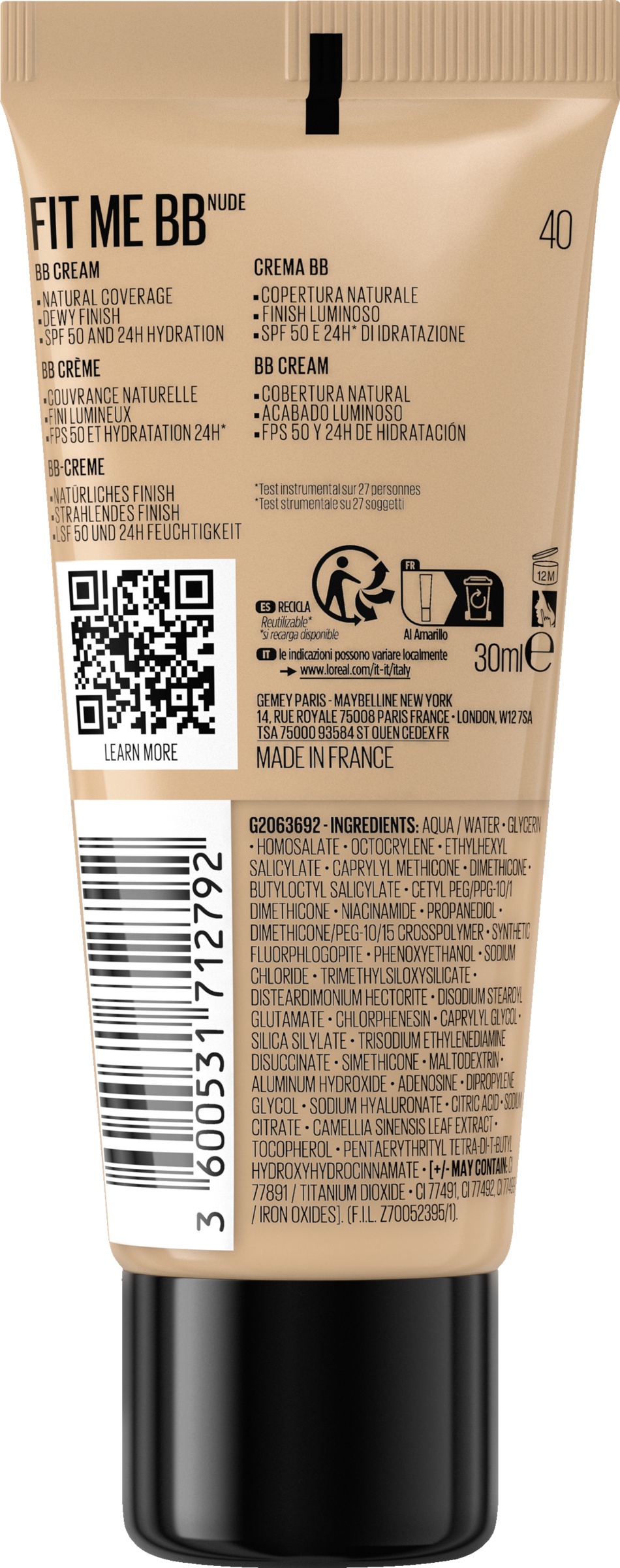 Für ein sofort und langfristig verbessertes Hautbild sorgt die Fit me Nude BB Cream 40 von Maybelline New York. Die hautperfektionierende BB Cream verleiht einen frischen und strahlenden Teint und spendet dank der Formel mit 90 % pflegenden Inhaltsstoffen der Haut 24 Stunden lang Feuchtigkeit. Gleichzeitig bietet sie durch den integrierten Lichtschutzfaktor 50 einen hohen Schutz vor den Auswirkungen der UV-Strahlung. Darüber hinaus fühlt sie sich angenehm leicht auf der Haut an und sorgt den ganzen Tag hindurch für einen makellosen Halt. Die Nuance der BB Cream passt sich zudem dem Hautton an, um so eine leichte und natürlich aussehende Abdeckung zu schaffen.