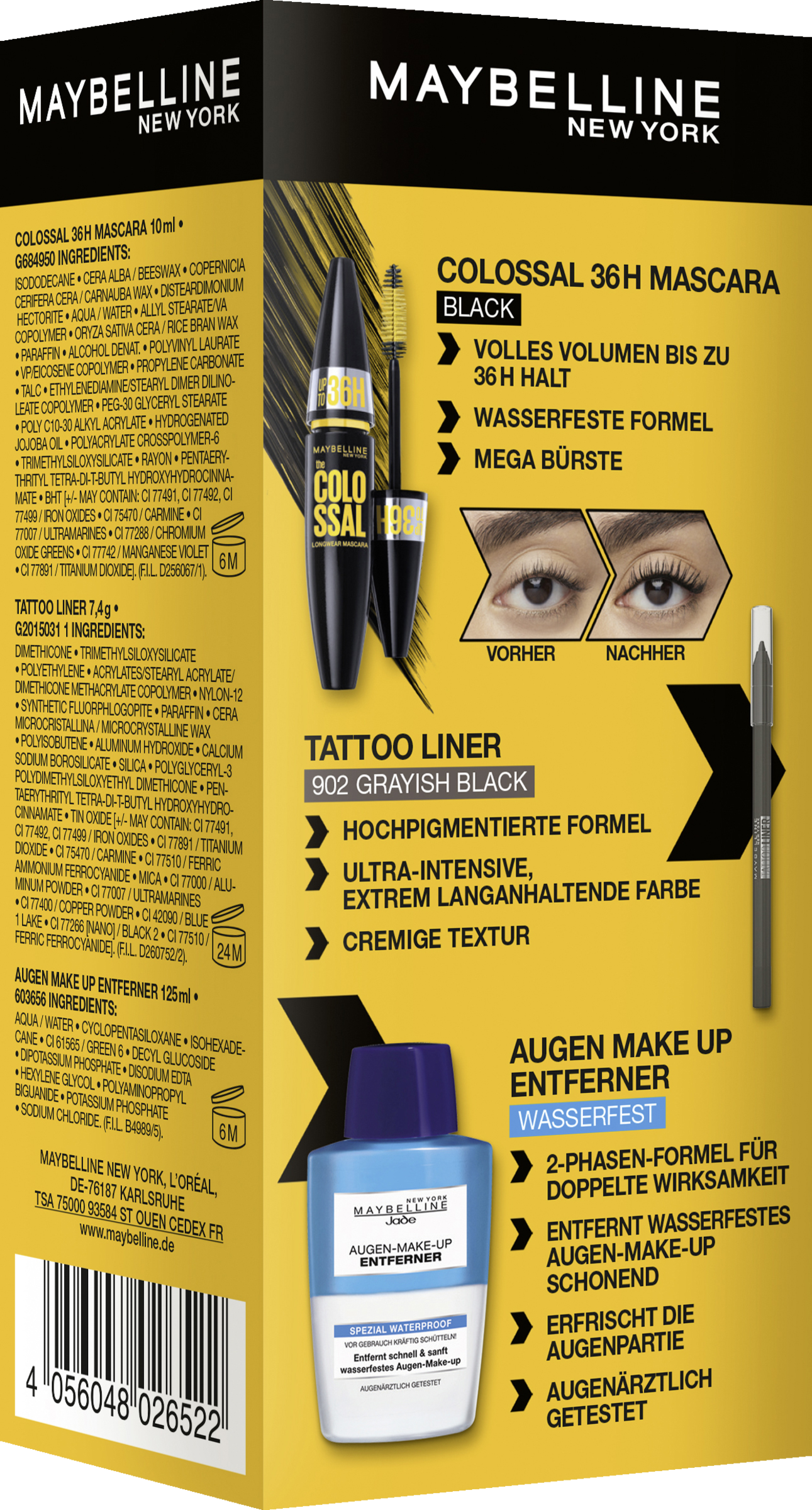 Das Set beinhaltet 1x Colossal 36H Mascara in Black (10 ml), 1x Tattoo Liner Gel Pencil Nr. 902 Grayish Black (7,4 g) sowie einen Augen-Make-Up Entferner Spezial Waterproof (125 ml).