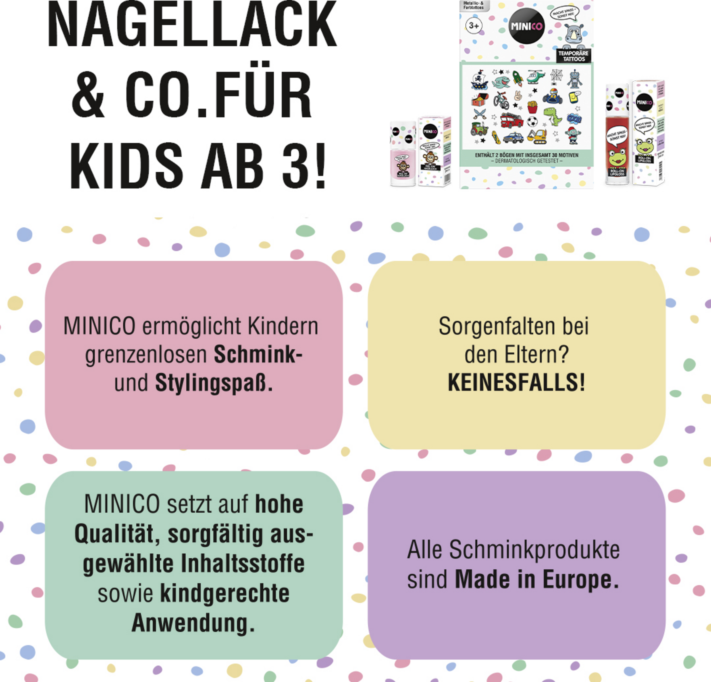 Sanft zu den Nägeln: Die Nagellackformulierung ist sehr gut verträglich, da sie speziell für Kinder entwickelt (Patch-Test durch ein unabhängiges Institut unter dermatologischer Kontrolle).