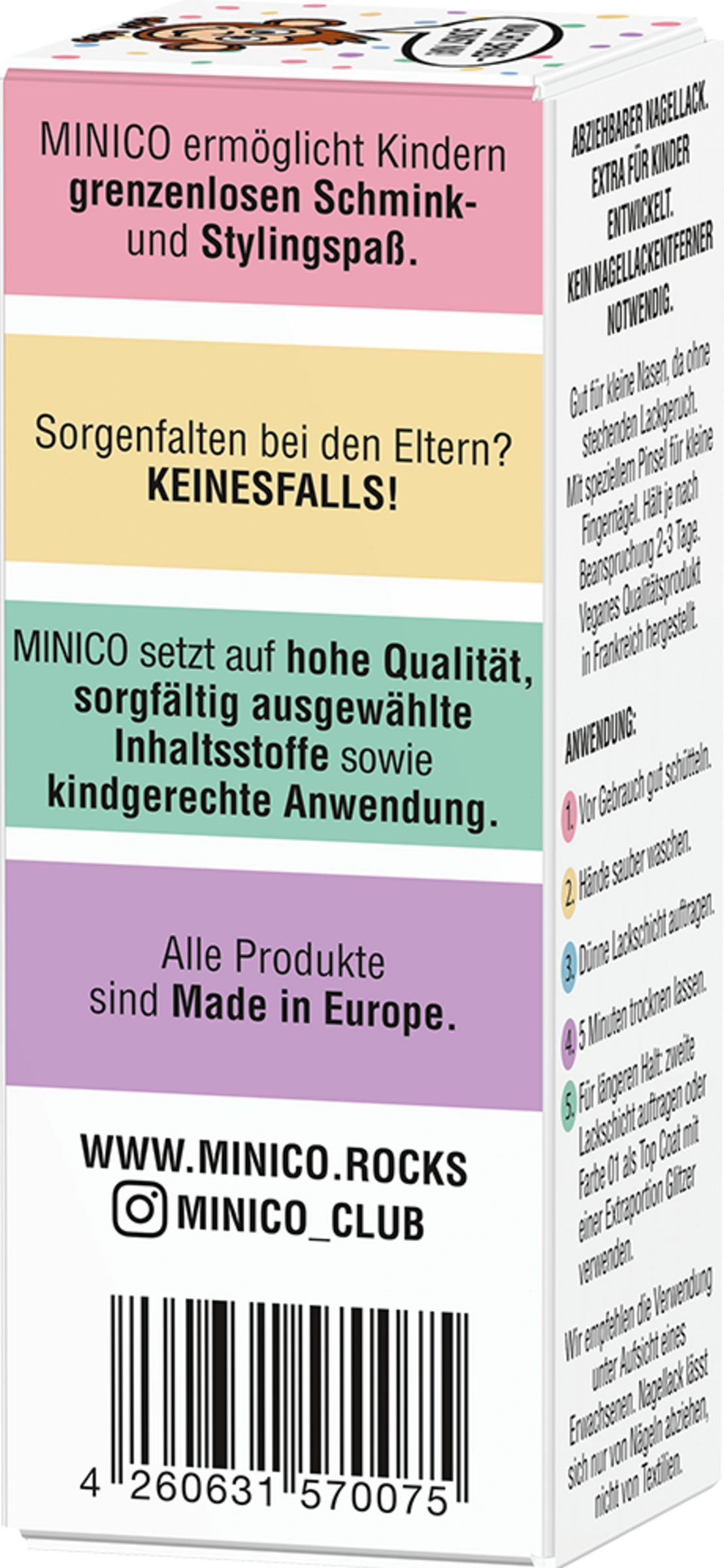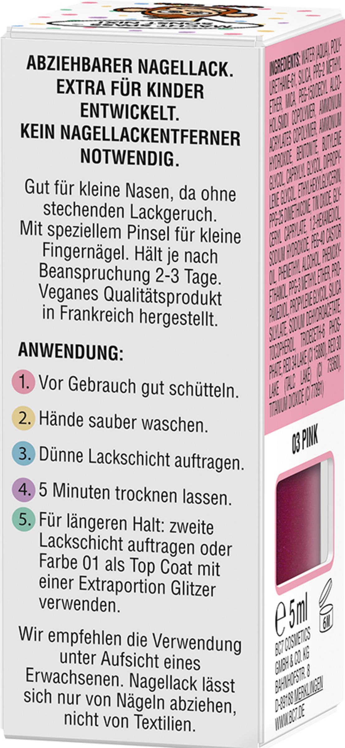 Sanft zu den Nägeln: Die Nagellackformulierung ist sehr gut verträglich, da sie speziell für Kinder entwickelt (Patch-Test durch ein unabhängiges Institut unter dermatologischer Kontrolle).