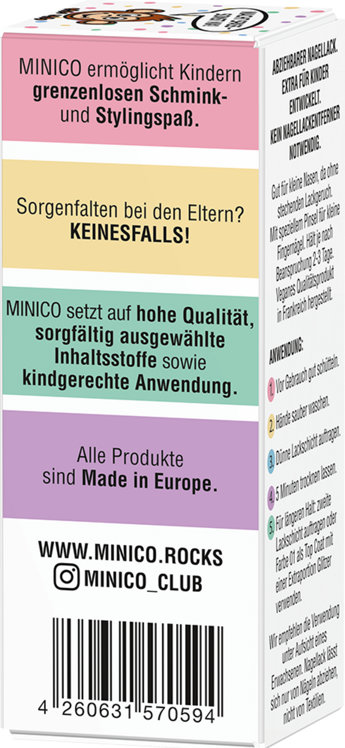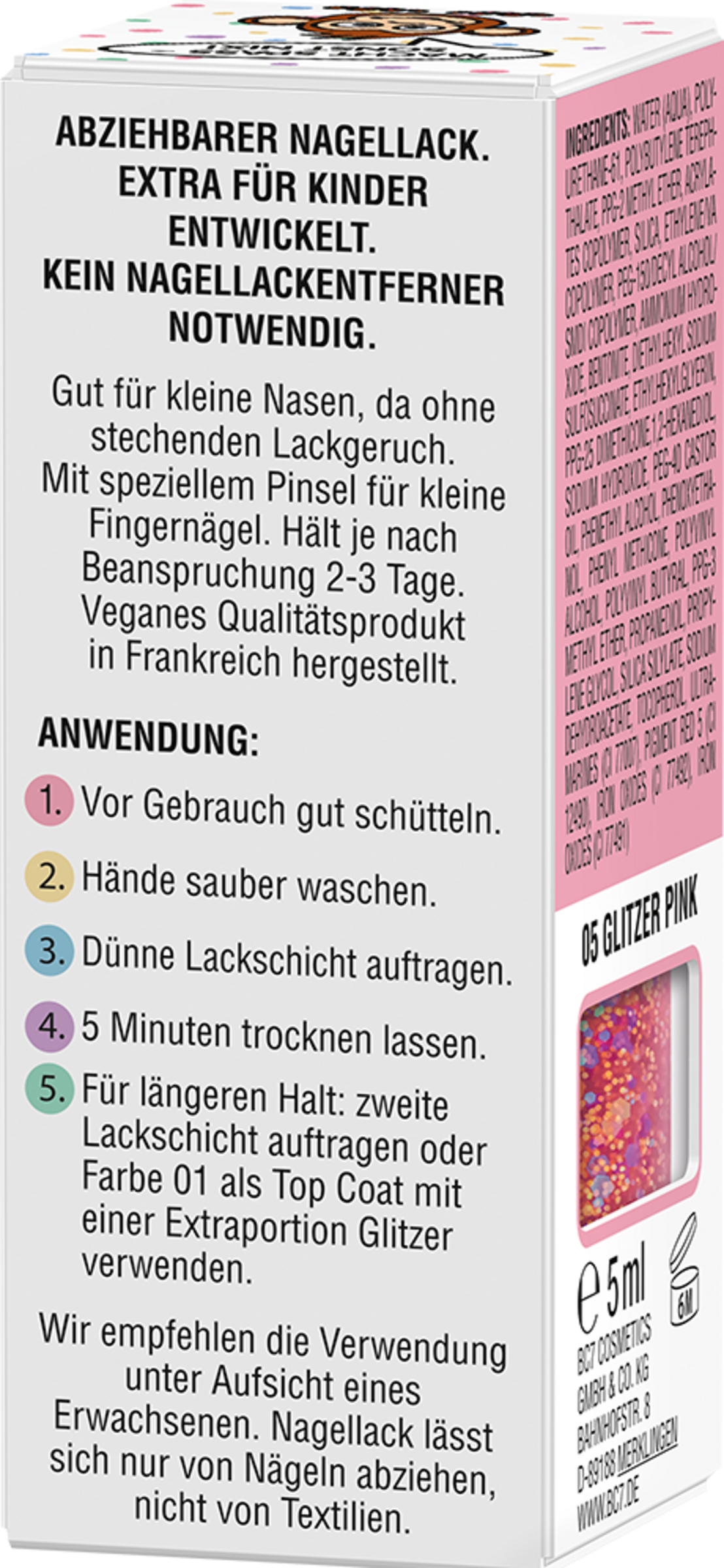 Sanft zu den Nägeln: Die Nagellackformulierung ist sehr gut verträglich, da sie speziell für Kinder entwickelt (Patch-Test durch ein unabhängiges Institut unter dermatologischer Kontrolle).