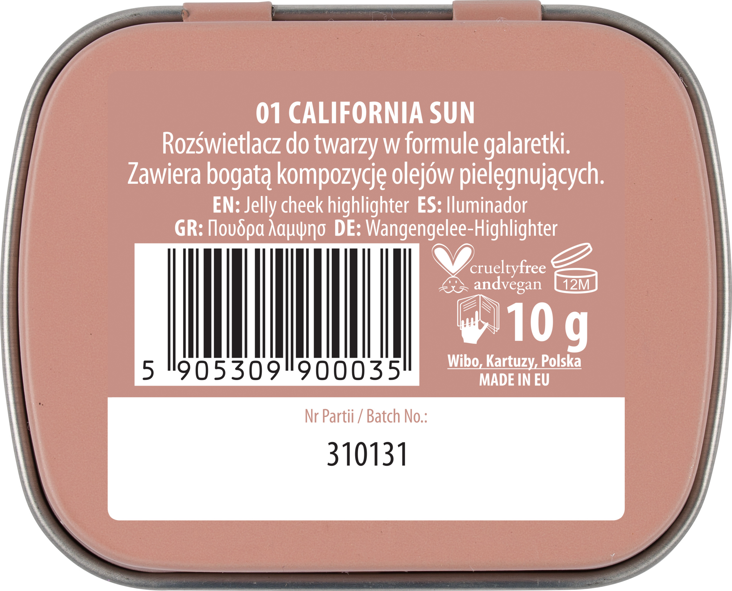 Gesichtshighlighter in einer Geleeformel. Er enthält eine reichhaltige Zusammensetzung aus pflegenden Ölen wie Sonnenblumenkernöl, Macadamiaöl und Kokosnussöl.