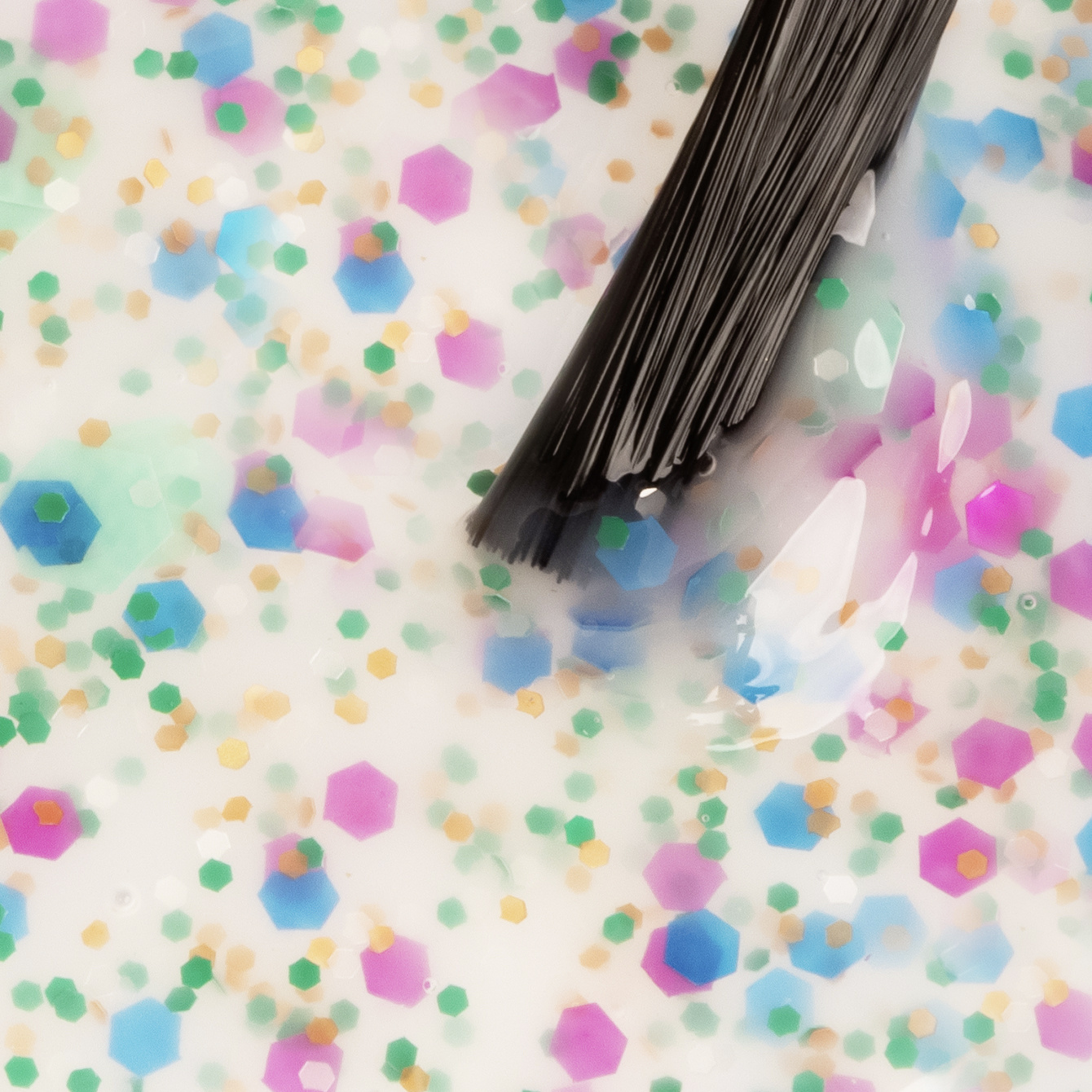 "Champion’s Confetti" überzeugt mit einem Finish im Konfetti Look: Mit Partikeln in Blau, Rosa, Orange und Grün verleiht der transparente UV Nagellack jedem sommerlichen Nageldesign das gewisse Etwas. Für einen farbenfrohen Energiekick und eine UV Maniküre, die bis zu 21 Tage splitter- und kratzfest bleibt.