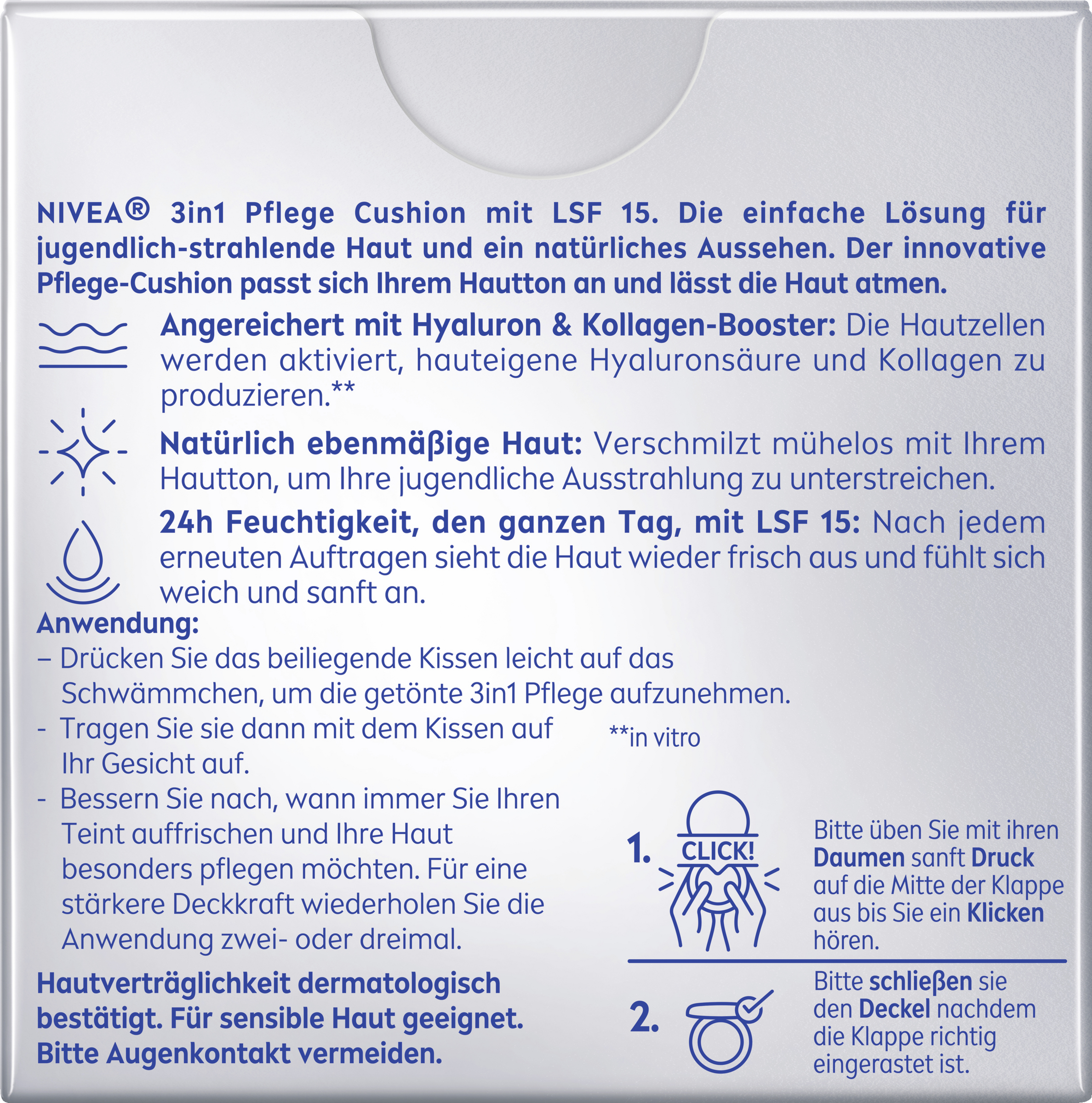 Die Haut sieht glatt aus, feine Fältchen werden sichtbar gemindert. Einfacher und pflegender als jedes Make-Up. Dank integriertem Spiegel fällt ein Auffrischen des Teints on-the-go leicht. Für frisch aussehende Haut nach jedem Auftragen. Erhältlich in drei Farbtönen: hell, mittel,dunkel.
