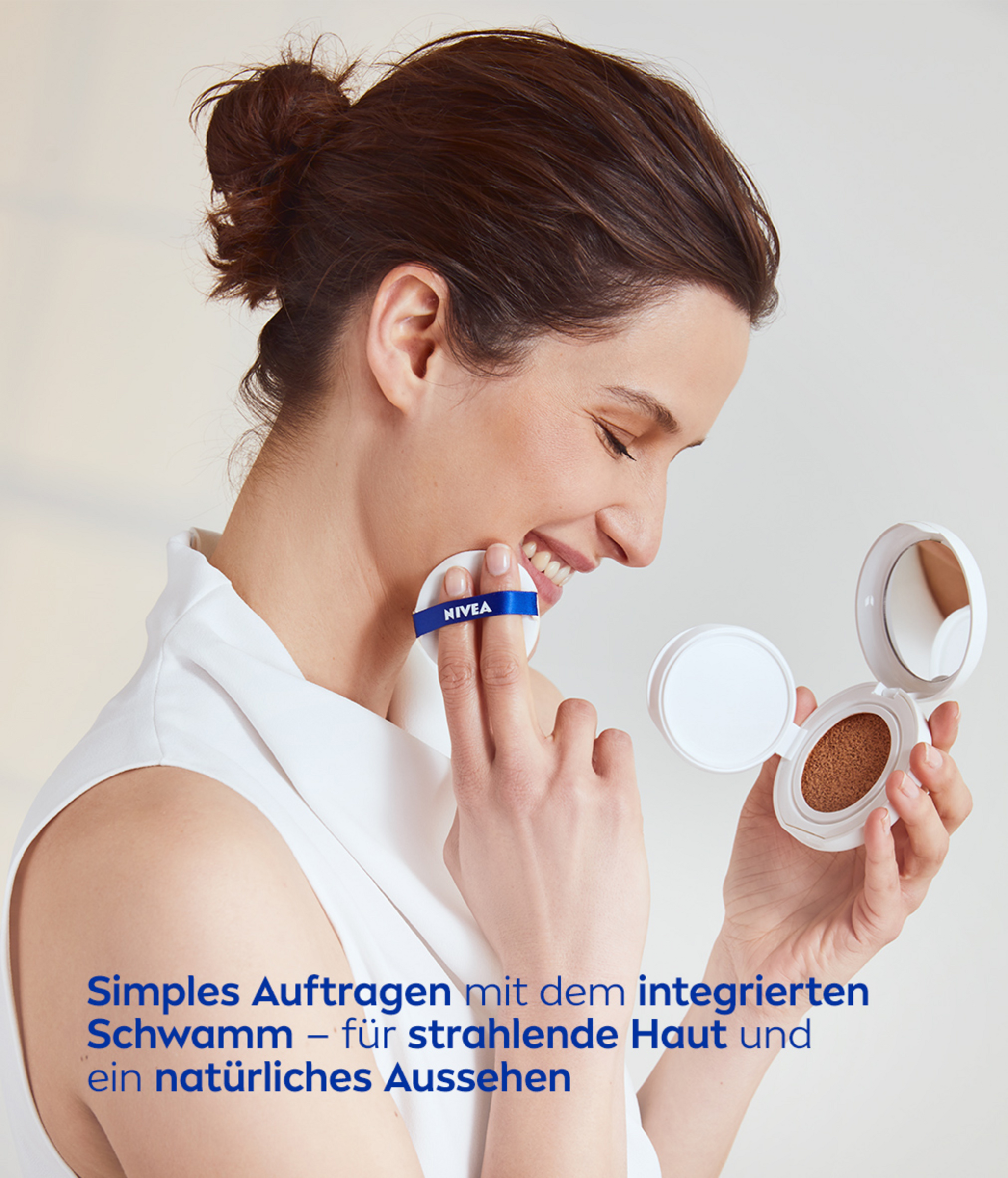 - Drücken Sie das beiliegende Kissen leicht auf das Schwämmchen, um die getönte 3in1 Pflege aufzunehmen.