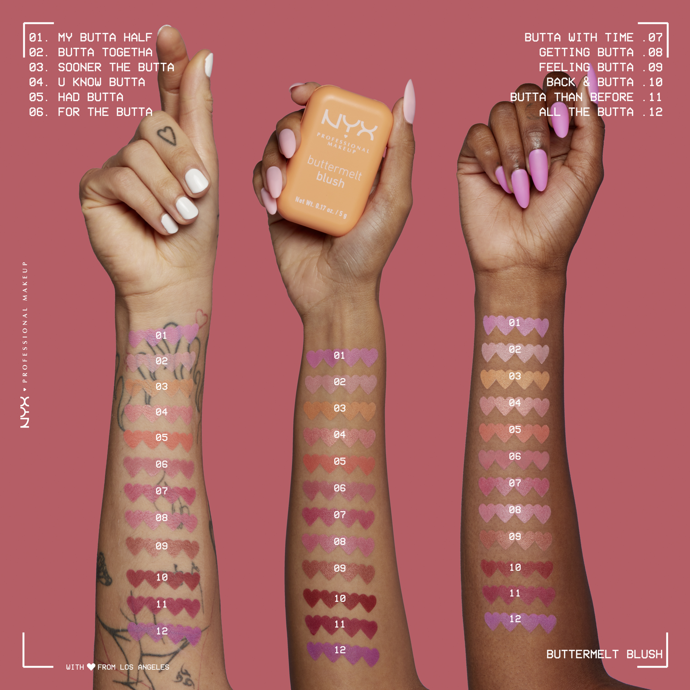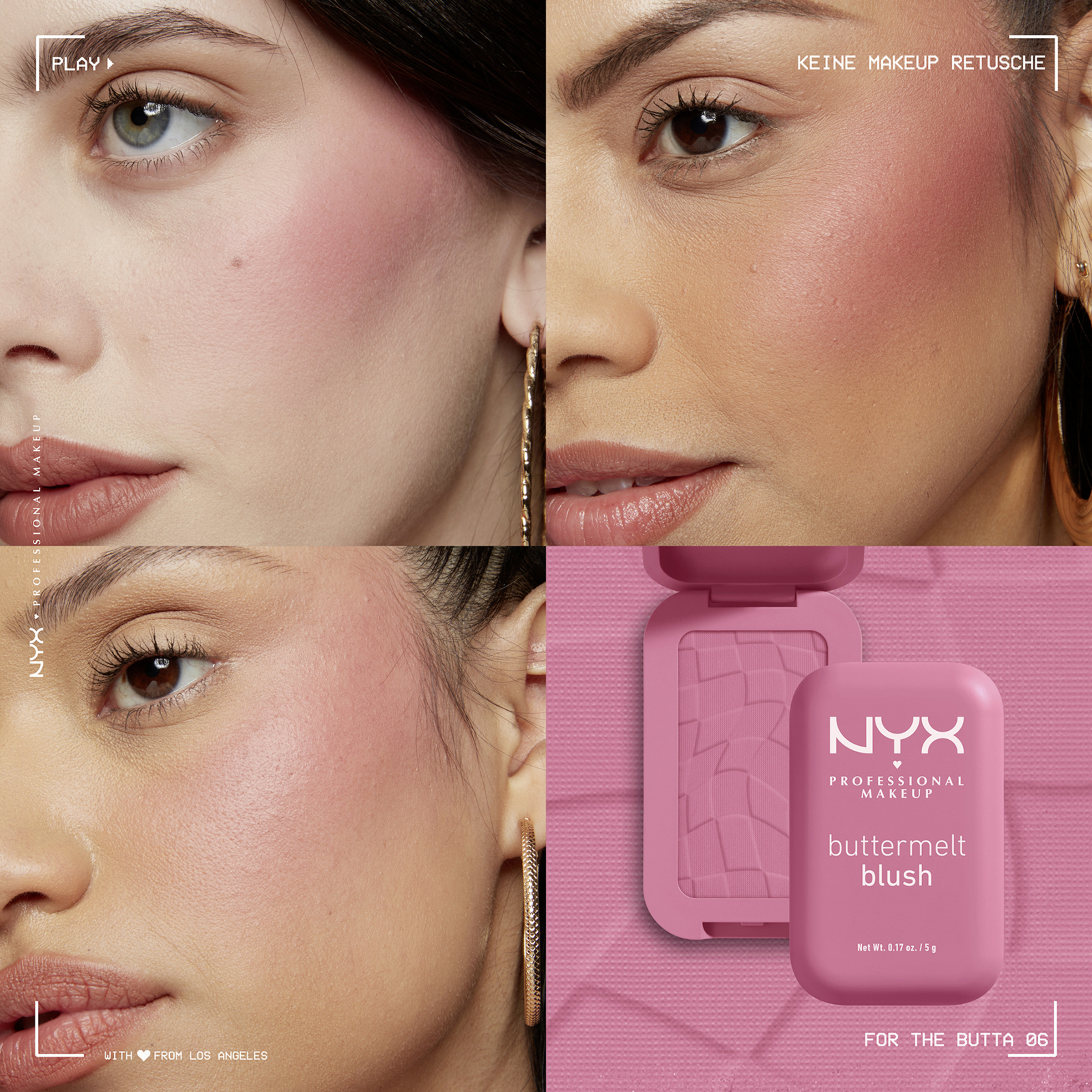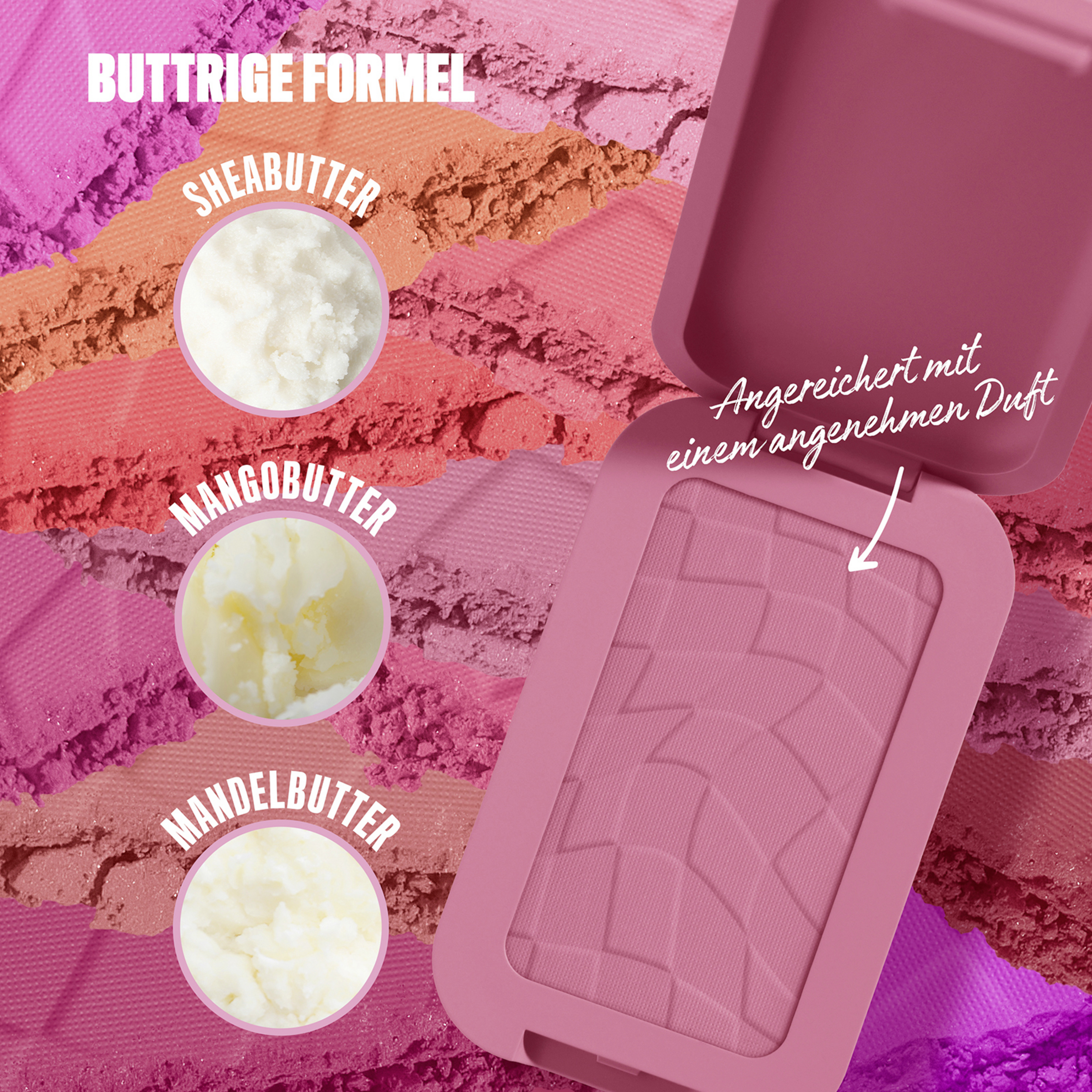 Der Buttermelt Blush von NYX Professional Make up ,,For the Butta'' setzt das Gesicht mit besonderer Frische in Szene. Dank der cremigen Textur verschmilzt der Blush wie ein Puder mit der Haut und lässt sich gleichzeitig wie Butter verblenden. Die angenehm leicht zu tragende Formulierung ist individuell für die gewünschte Farbintensität aufbaubar. Egal, ob weniger Blush für den Tag oder etwas mehr Farbe für den Abend – der Buttermelt Blush macht es möglich. Darüber hinaus zeichnet sich der Buttermelt Blush durch eine pflegende Formel aus, die sowohl aus Shea Butter als auch Mandelbutter besteht und dank Mangobutter zusätzlich einen betörenden Duft hat.