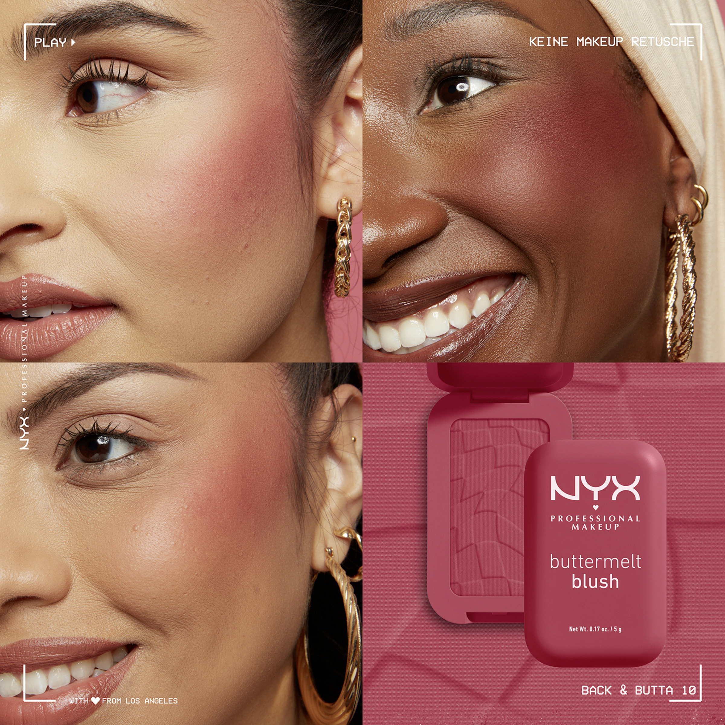 Der Buttermelt Blush von NYX Professional Make up My Butta Half setzt das Gesicht mit besonderer Frische in Szene. Dank der cremigen Textur verschmilzt der Blush wie ein Puder mit der Haut und lässt sich gleichzeitig wie Butter verblenden. Die angenehm leicht zu tragende Formulierung ist individuell für die gewünschte Farbintensität aufbaubar. Egal, ob weniger Blush für den Tag oder etwas mehr Farbe für den Abend – der Buttermelt Blush macht es möglich. Darüber hinaus zeichnet sich der Buttermelt Blush durch eine pflegende Formel aus, die sowohl aus Shea Butter als auch Mandelbutter besteht und dank Mangobutter zusätzlich einen betörenden Duft hat.