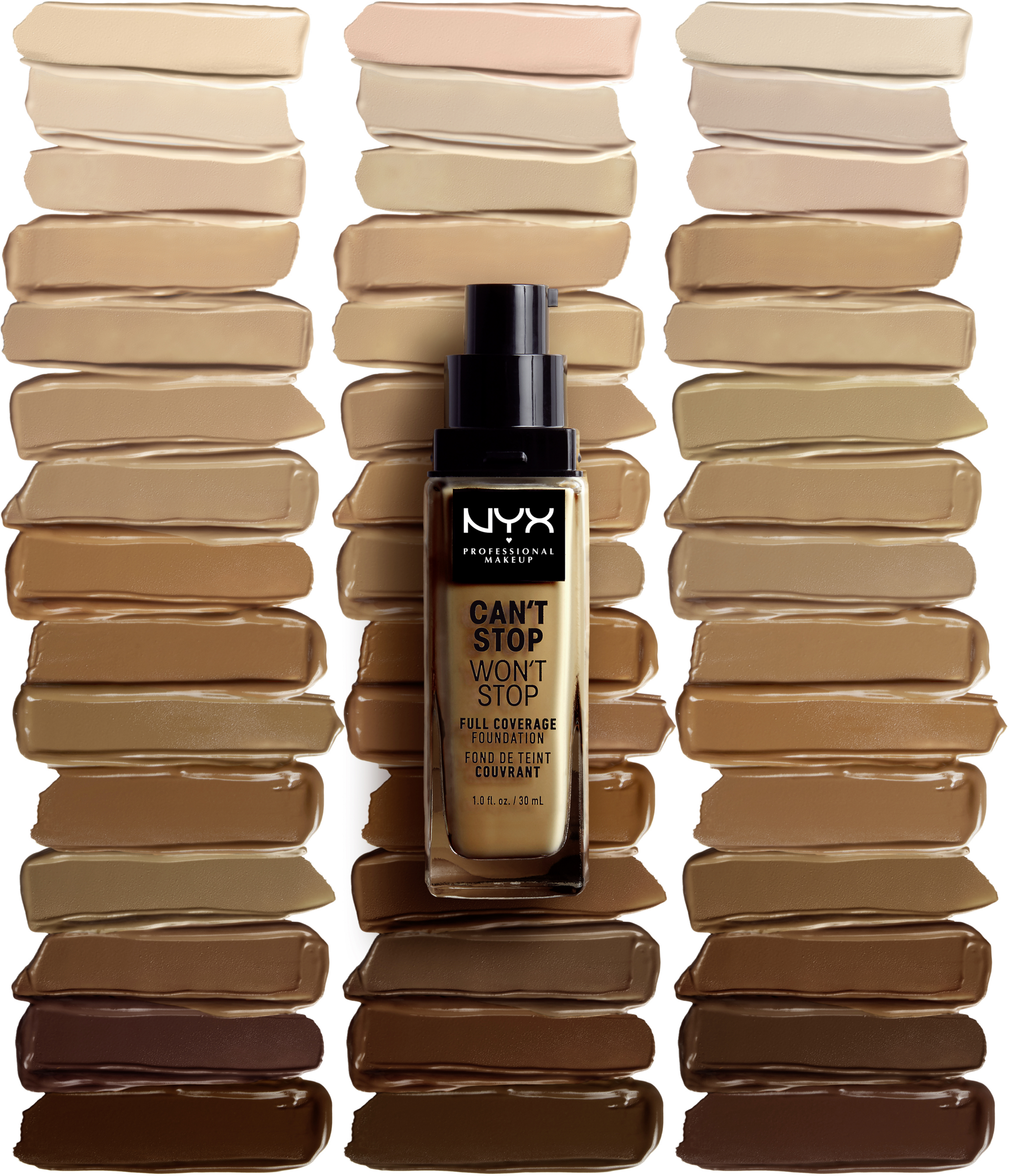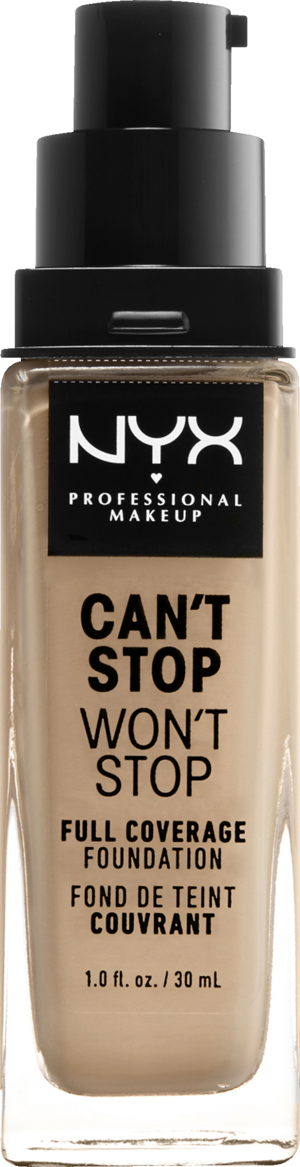 Matte Flüssigfoundation für Gesicht und Dekolleté, Für volle und angenehme Abdeckung - Ideal für alle Hauttöne mit einem warmen, kalten oder neutralen Unterton, Geeignet für normale, fettige und Mischhaut - Einfach verwendbares Pump Spray, Cremige Textur mit leichtem Finish, Verblenden Sie das Makeup durch Tupfbewegungen für eine gleichmäßige Abdeckung, Tragen Sie für höhere Deckkraft eine weitere Schicht auf - Nicht-komedogene Zusammensetzung mit Inhaltsstoffen zur Vermeidung von verstopften Poren, Vegane Formel, Wasserfest für langanhaltende Deckkraft - Lieferumfang: 1x NYX Professional Makeup Can't Stop Won't Stop Full Coverage Foundation, Vanilla, 30 ml