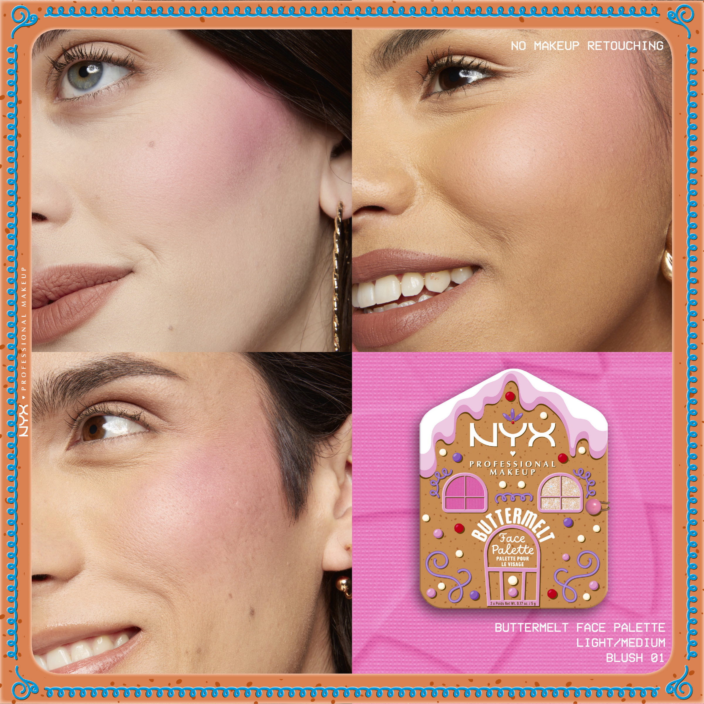 - die Holiday 2025 Buttermelt Face Palette Light/Medium enthält einen hellen Highlighter und einen Rosa Blush