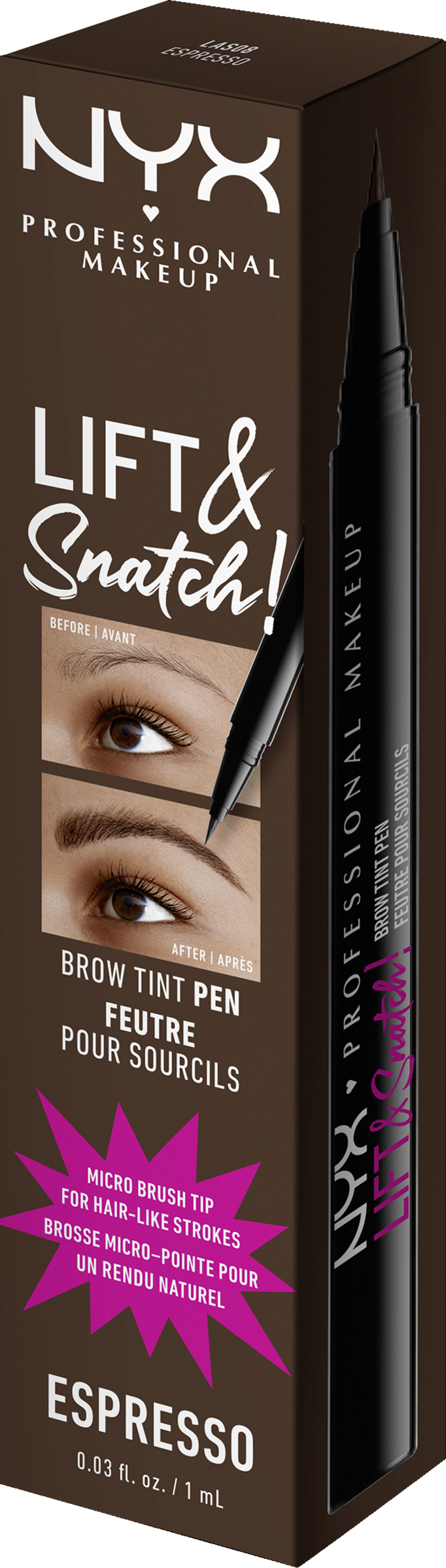 Mit dem Lift & Snatch Brow Tint Pen von NYX Professional Makeup lassen sich mit Leichtigkeit individuelle Looks im Bereich der Augenbrauen kreieren: Die ultradünne und flexible Spitze des Stiftes lässt sich einfach und effektiv handhaben. Mit leichtem Druck lassen sich ganz feine Härchen für einen sehr natürlichen Stil auftragen. Volle und ausdrucksstarke Augenbrauen sind mit eher kurzen und festen Strichen möglich. Am besten immer zu einer Nuance greifen, die optimal auf die eigene Haarfarbe an den Augenbrauen angepasst ist. Espresso eignet sich optimal für schwarzbraune Haare.