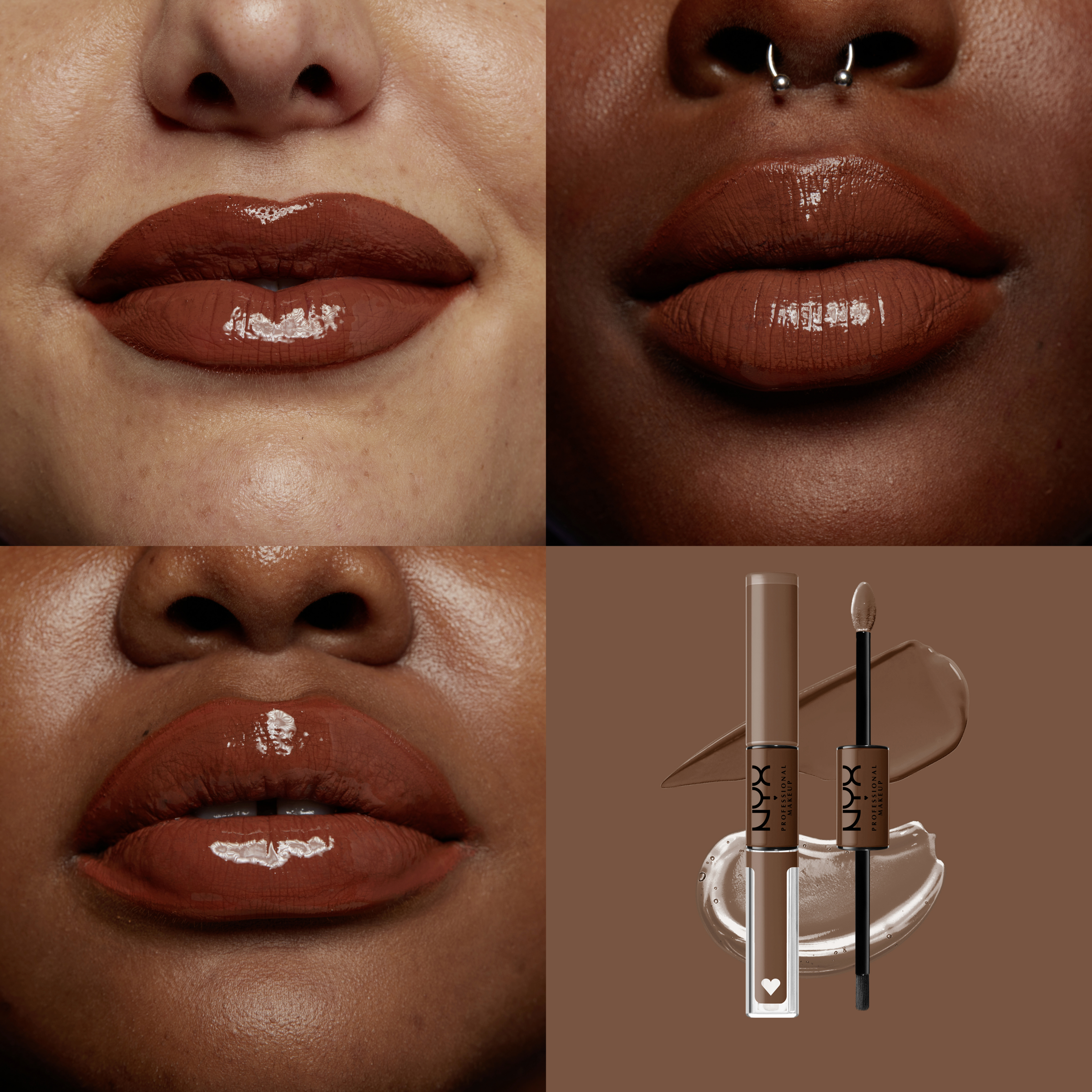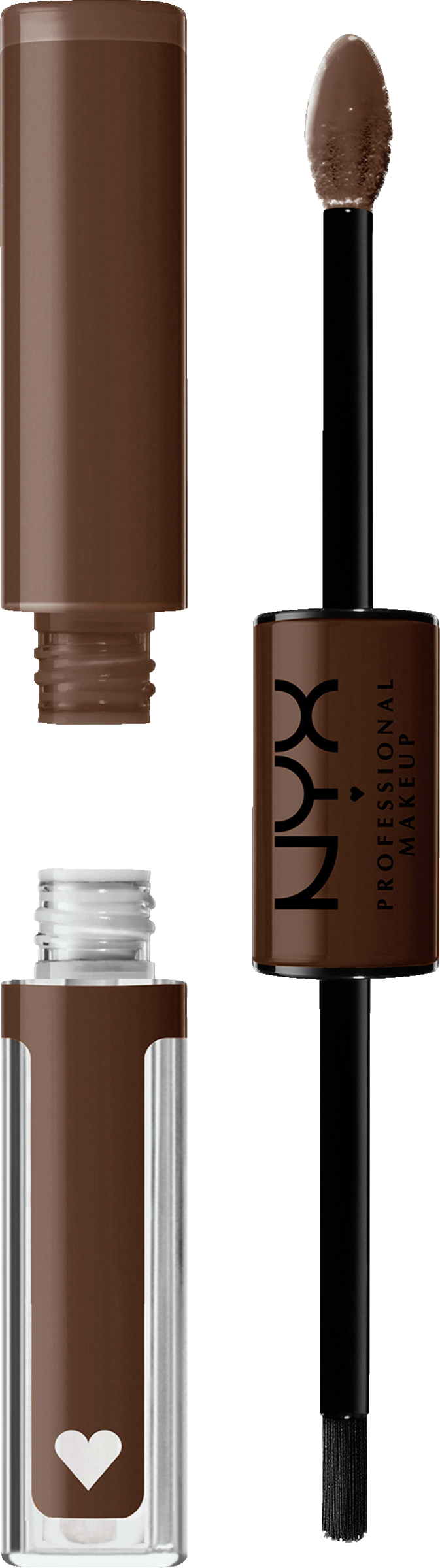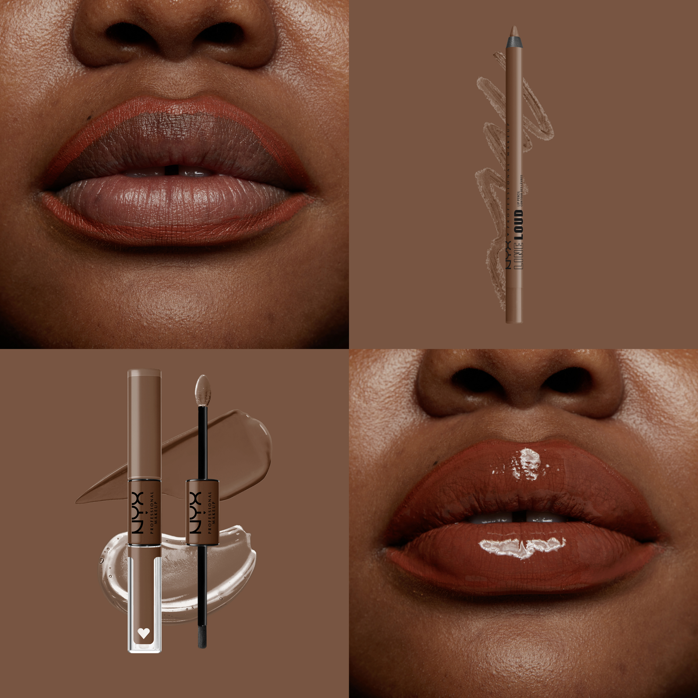 Mit dem Shine Loud High Pigment Lip Shine in der Farbe Total Baller von NYX Professional Makeup gelingt ein sattes Lippen-Makeup in warmem Braun für jeden Anlass. Um die hochpigmentierte Farbe präzise auf die Lippen aufzutragen, diese zunächst mithilfe des speziell geformten Applikators entlang der Lippenkontur verstreichen, schließlich auf die Flächen geben. Nach einer kurzen Trockenzeit wird dann der dazugehörige Top-Coat am anderen Ende des Sticks aufgetragen. Erst dadurch wird die Farbe für bis zu 16 Stunden versiegelt und haltbar gemacht und das Makeup erhält sein atemberaubendes glossy Finish.