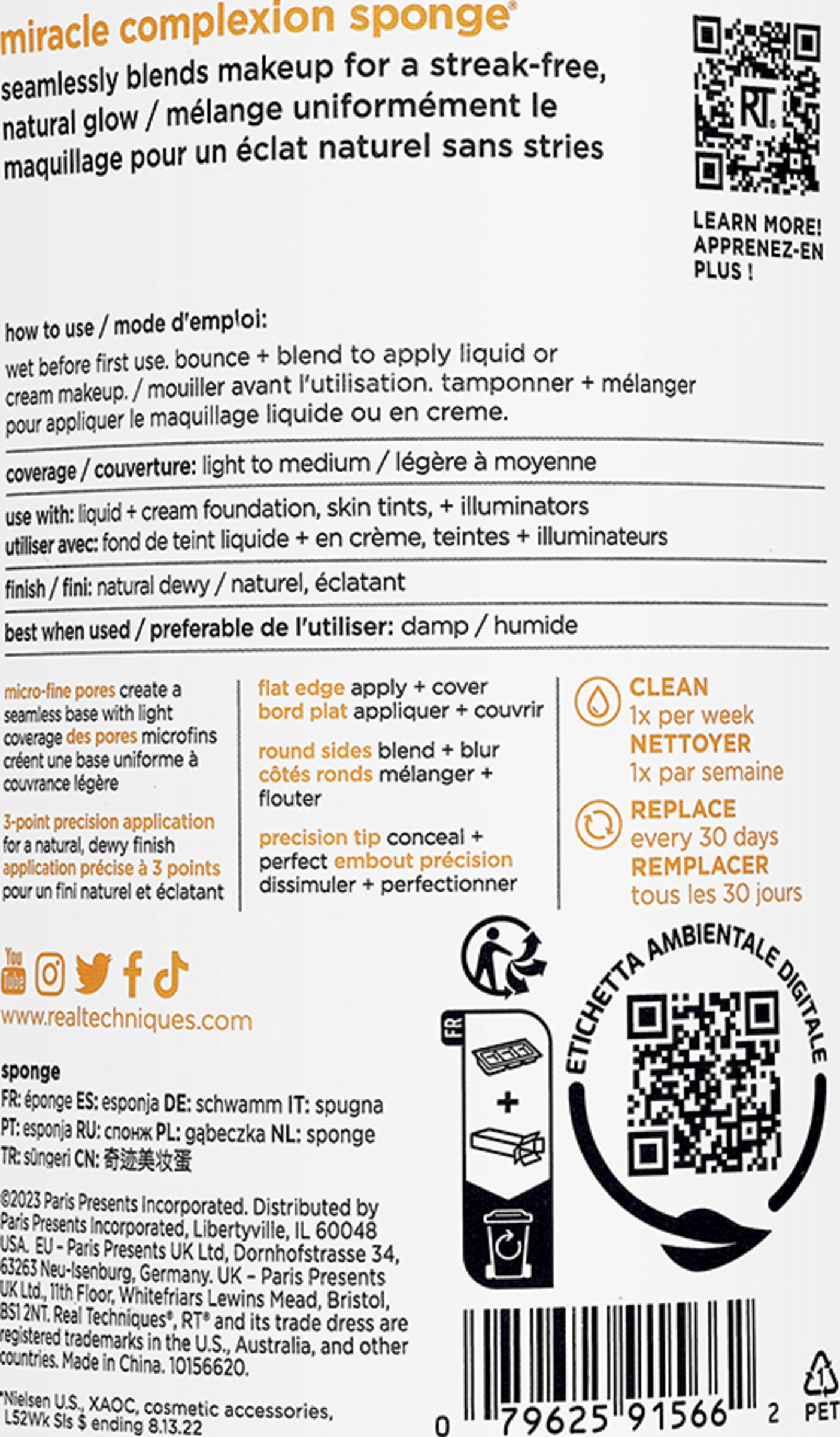 Der Real Techniques Miracle Complexion Schwamm kann in nassem oder trockenem Zustand zusammen mit flüssiger Foundation oder Make-up verwendet werden. Die drei verschiedenen Oberflächen des 3-in-1 Make-up-Schwamms ermöglichen es, jede Stelle des Gesichts problemlos zu erreichen. Die abgerundeten Seiten eignen sich ideal zum Verblenden von größeren Bereichen, während die Präzisionsspitze der Abdeckung kleinerer Makel dient und die flache Kante sich optimal den Konturen um Augen und Nase anpasst.