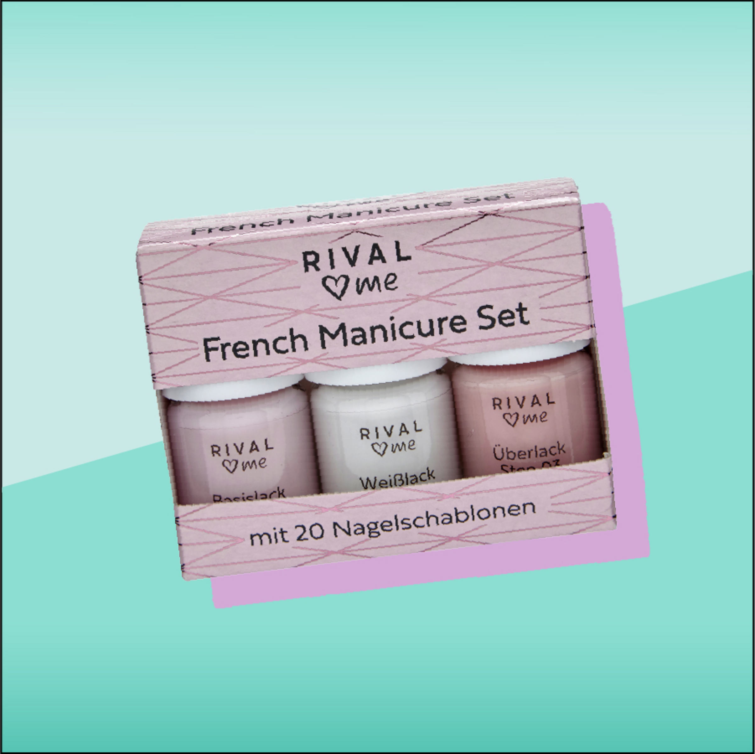 Das RIVAL loves me French Manicure Set enthält alles für den gepflegten French Manicure-Look: Basislack, Weißlack für die Spitzen, Überlack und 20 Nagelschablonen.