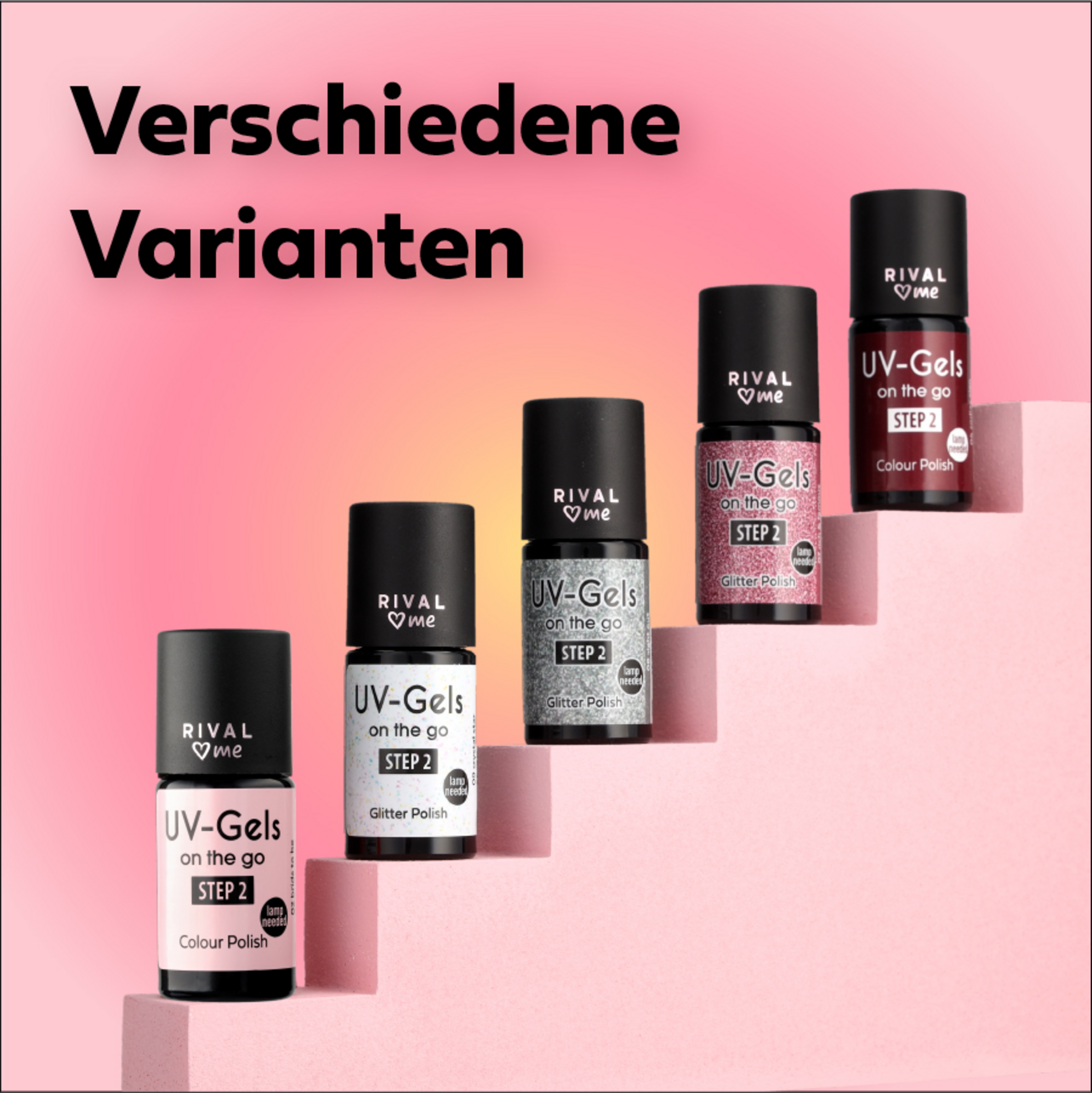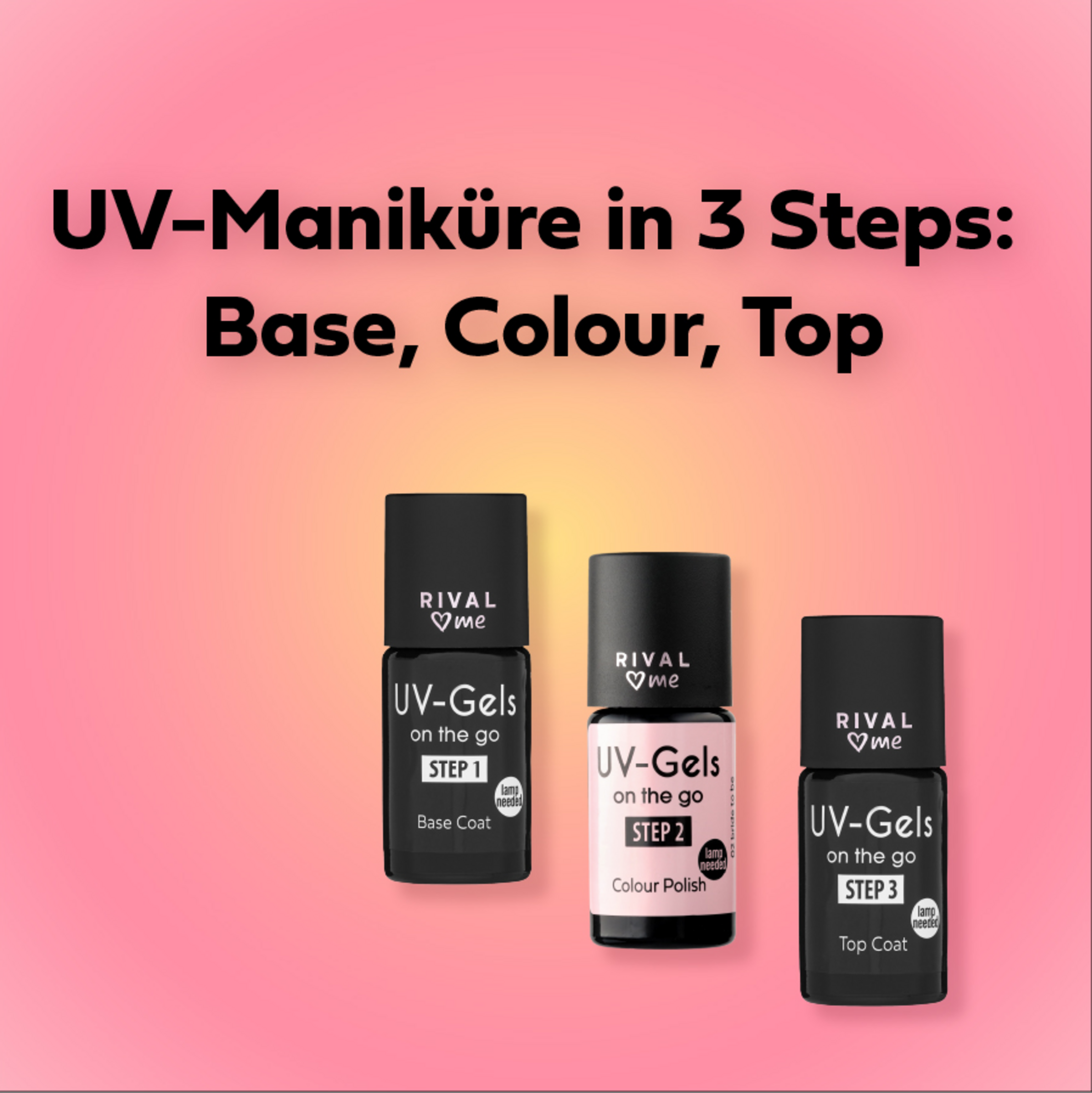 Den Farblack auf die Base (Step 1) auftragen und 60 Sekunden unter einer UV-Lampe aushärten lassen. Für ein intensiveres Ergebnis, diesen Vorgang wiederholen.