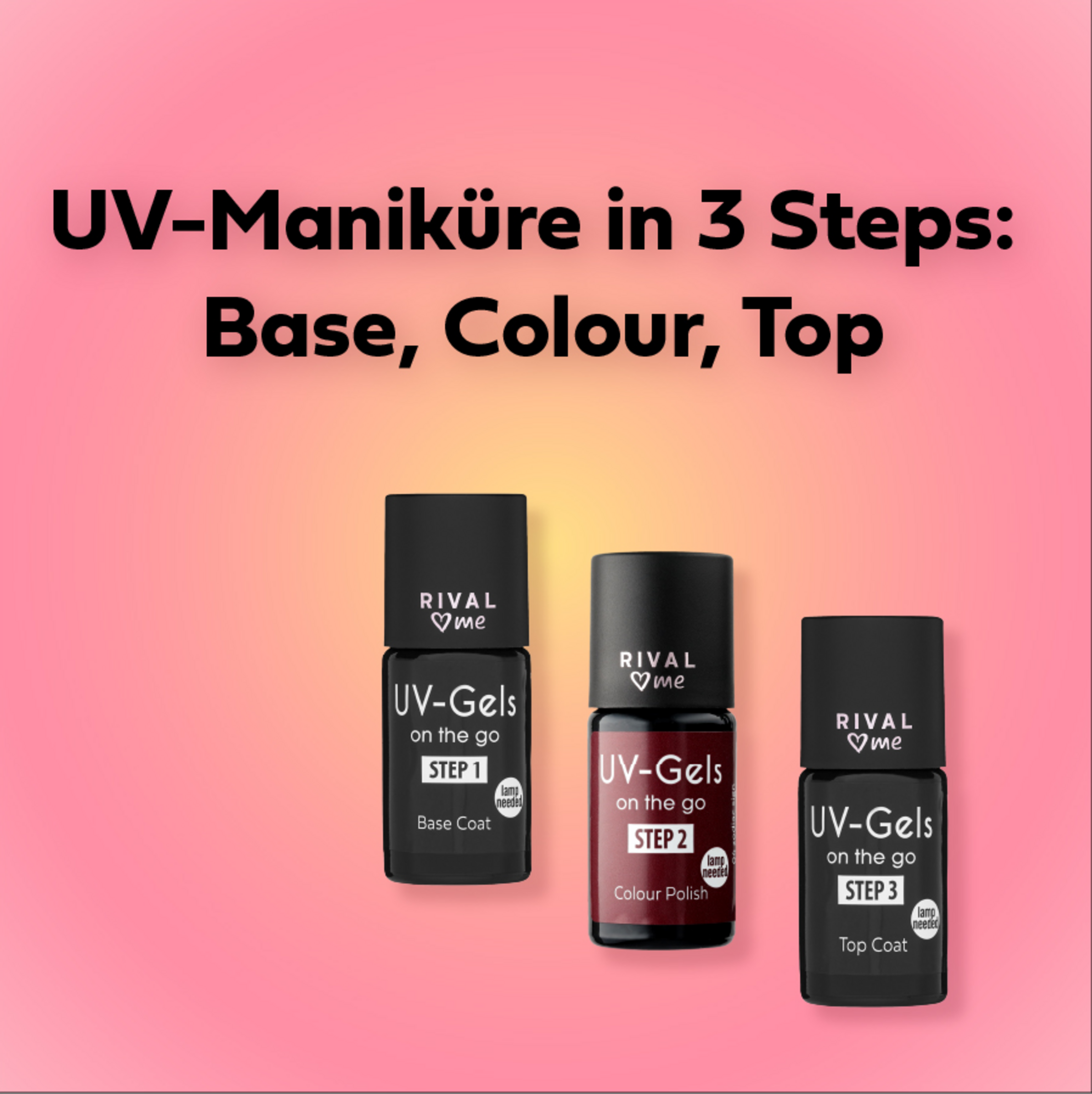 Den Farblack auf die Base (Step 1) auftragen und 60 Sekunden unter einer UV-Lampe aushärten lassen. Für ein intensiveres Ergebnis, diesen Vorgang wiederholen.