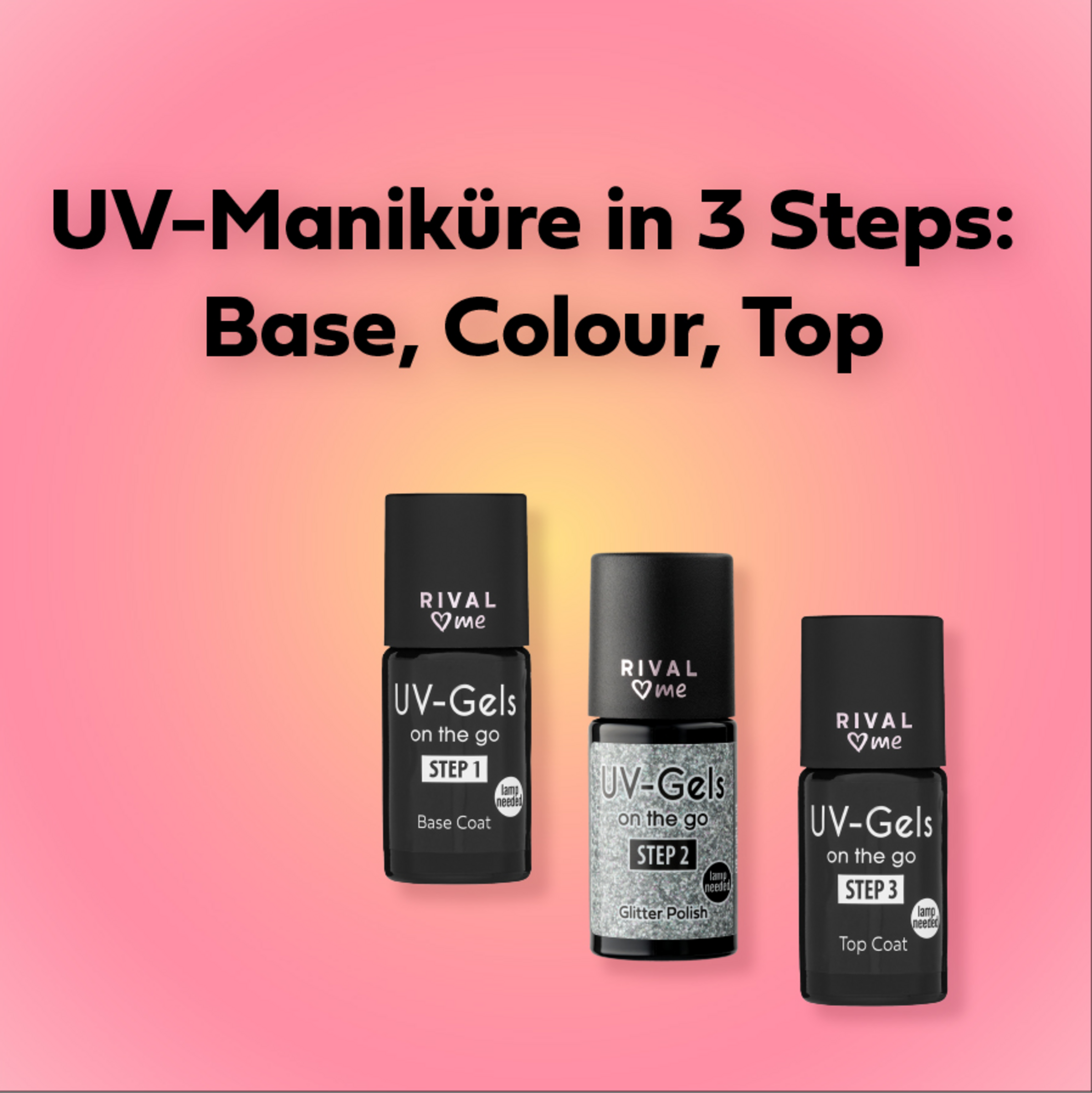 Auf den gesunden Nagel auftragen. Den Farblack auf die Base (Step 1) auftragen und 60 Sekunden unter einer UV-Lampe aushärten lassen. Für ein intensiveres Ergebnis, diesen Vorgang wiederholen.