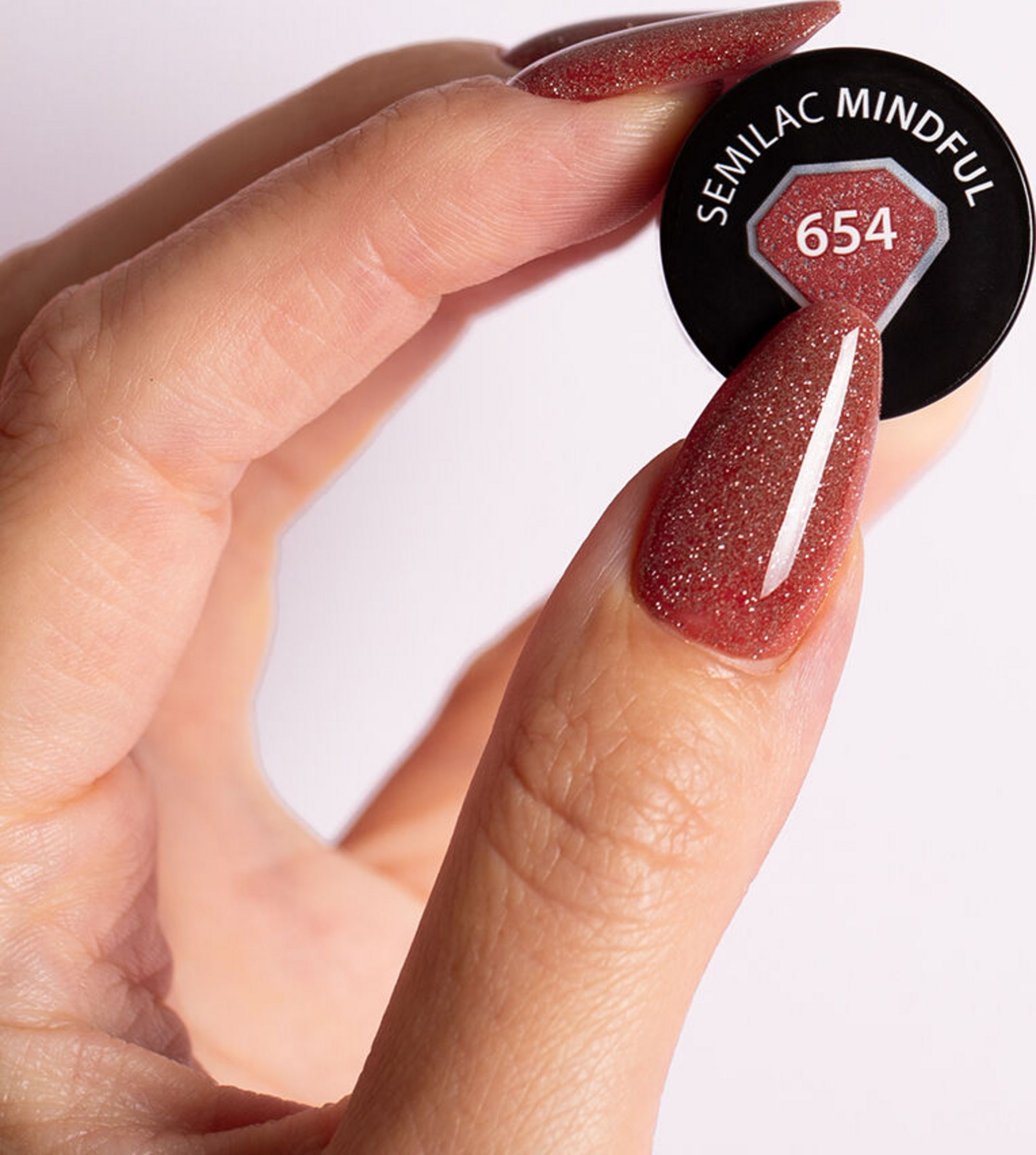 Eine dünne Schicht Semilac Color auf die ausgehärtete Semilac Base Schicht auftragen und dann unter einer UV-Lampe aushärten. Nicht direkt auf die Nagelplatte auftragen. Für einen zufriedenstellenden Look kann die Anwendung von Semilac Color wiederholt werden. Zum Abschluss des Nageldesigns Semilac Top auftragen und aushärten.