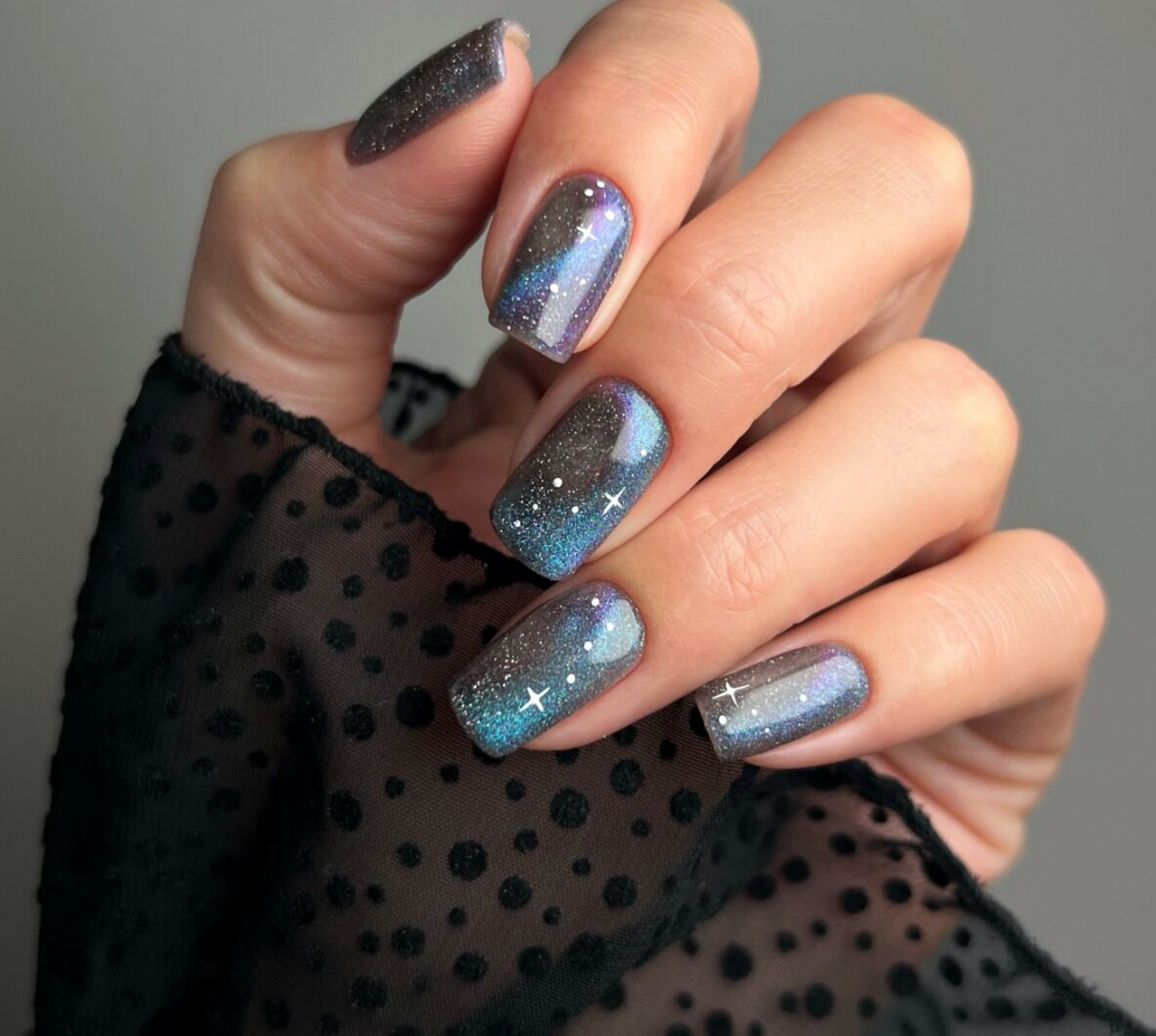Grey Holo kombiniert den Schimmer von Violett-Blau mit einer semi-transparenten galaktischen Graubasis, um außergewöhnliche Tiefe und einen kosmischen Glanz für ein wirklich anderes Nagelerlebnis zu bieten.