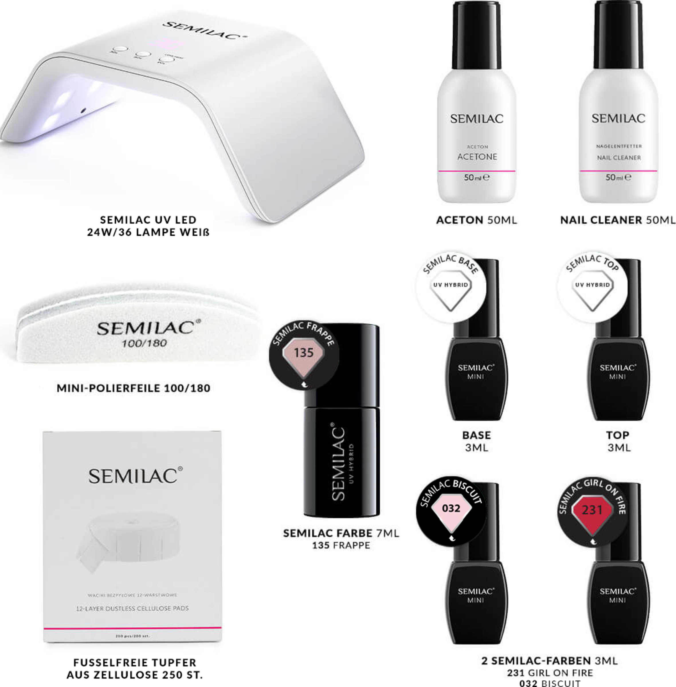 * Semilac UV Nagellack 135 Frappe 7 ml: Di-HEMA Trimethylhexyl Dicarbamate, HEMA, Hydroxycyclohexyl Phenyl Ketone, Bis-Trimethylbenzoyl Phenylphosphine Oxide, p-Hydroxyanisole, (+/-) CI 77891, CI 77491, CI 77492, CI 77510, CI 77289, CI 77266, CI 77742, CI 15850.* Semilac UV Nagellack 032 Biscuit 3 ml: Di-HEMA Trimethylhexyl Dicarbamate, HEMA, Hydroxycyclohexyl Phenyl Ketone, Bis-Trimethylbenzoyl Phenylphosphine Oxide, p-Hydroxyanisole, (+/-) CI 77891, CI 77491, CI 77492, CI 77510, CI 77289, CI 77266, CI 77742, CI 15850.* Semilac UV Nagellack 231 Girl on Fire 3 ml: Di-HEMA Trimethylhexyl Dicarbamate, HEMA, Hydroxycyclohexyl Phenyl Ketone, Bis-Trimethylbenzoyl Phenylphosphine Oxide, p-Hydroxyanisole, (+/-) CI 77891, CI 77491, CI 77492, CI 77510, CI 77289, CI 77266, CI 77742, CI 15850.* Semilac Top 3 ml: Polyurethane Acrylate Oligomer, HEMA, Hydroxycyclohexyl Phenyl Ketone, Bis-Trimethylbenzoyl Phenylphosphine Oxide.* Semilac Base 3 ml: Polyurethane Acrylate Oligomer, HEMA, Hydroxycyclohexyl Phenyl Ketone, Bis-Trimethylbenzoyl Phenylphosphine Oxide.* Acetone: Acetone* Nail Cleaner: Isopropyl Alcohol, Aqua.